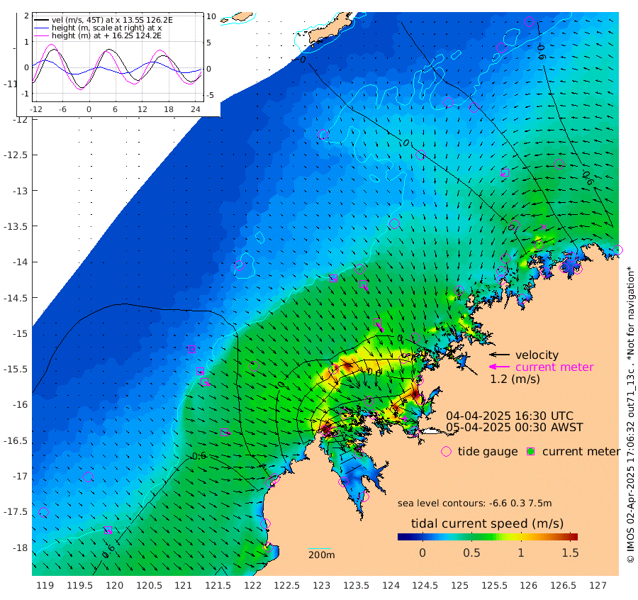 18cm/s 125T +10cm/s rms + 1cm/s 1T. NWSBRW 205m 26cm/s 136T +11cm/s rms + 6cm/s -110T. NWSROW 199m 65cm/s 148T +5cm/s rms + 2cm/s 65T. CAM050 58m 45cm/s 146T +12cm/s rms + 5cm/s 92T. CAM100 99m 9cm/s 121T +7cm/s rms + 1cm/s -85T. KIM400 396m 20cm/s 119T +9cm/s rms + 5cm/s -119T. KIM200 208m 37cm/s 126T +11cm/s rms + 5cm/s -147T. KIM100 99m 41cm/s 105T +8cm/s rms + 3cm/s -103T. KIM050 59m 30cm/s -124T +4cm/s rms + 2cm/s 23T. TIMORS88 91m -53cm Imperieuse Reef 38cm Mermaid Reef 122cm Broome 85cm Cape Baskerville 78cm Red Bluff 77cm Cape Boileau 23cm Scott Reef (WA) 3cm Ashmore Reef -50cm Karrakatta Bay -87cm Sunday Island -319cm Valentine Island -392cm Derby -279cm Port Usborne 1cm Bedford Islands 26cm Yampi Sound (Koolan Island) 9cm Macleay Island 32cm Adele Island 101cm Browse Island -13cm Shale Island -16cm Lizard Island 27cm Hall Point 59cm Degerando Island 85cm White Island 3cm Skua No. 4 Well -54cm Jabiru 74cm Maret Island 73cm Baudin Island 67cm Cape Voltaire (Krait Bay) -45cm Dillon Shoal -13cm Laminaria 68cm Port Warrender -4cm Troughton Island 52cm Cassini Island 25cm West Holothuria Reef Offshore 17cm Jar Island 39cm Lynher Bank 50cm Heywood Shoal -26cm Pee Shoal -28cm Van Cloon Shoal 9cm Carronade Island 5cm Guy Point 3cm Napier Broome Bay -44cm Lesueur Island