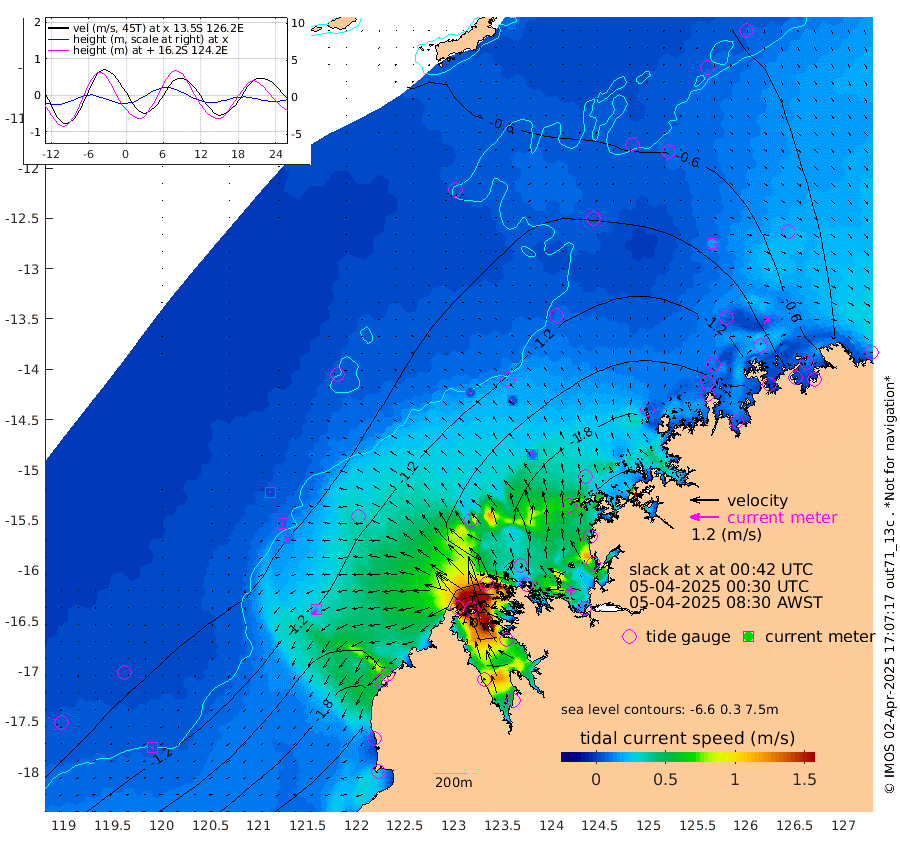 6cm/s 152T +10cm/s rms + 1cm/s 1T. NWSBRW 205m 5cm/s -153T +11cm/s rms + 6cm/s -110T. NWSROW 199m 10cm/s -32T +5cm/s rms + 2cm/s 65T. CAM050 58m 6cm/s -81T +12cm/s rms + 5cm/s 92T. CAM100 99m 3cm/s -127T +7cm/s rms + 1cm/s -85T. KIM400 396m 8cm/s -106T +9cm/s rms + 5cm/s -119T. KIM200 208m 12cm/s -116T +11cm/s rms + 5cm/s -147T. KIM100 99m 23cm/s -144T +8cm/s rms + 3cm/s -103T. KIM050 59m 16cm/s 103T +4cm/s rms + 2cm/s 23T. TIMORS88 91m -61cm Imperieuse Reef -75cm Mermaid Reef -212cm Broome -142cm Cape Baskerville -150cm Red Bluff -147cm Cape Boileau -63cm Scott Reef (WA) -68cm Ashmore Reef -145cm Karrakatta Bay -123cm Sunday Island 17cm Valentine Island 88cm Derby -16cm Port Usborne -174cm Bedford Islands -234cm Yampi Sound (Koolan Island) -220cm Macleay Island -145cm Adele Island -101cm Browse Island -268cm Shale Island -290cm Lizard Island -222cm Hall Point -207cm Degerando Island -214cm White Island -68cm Skua No. 4 Well -50cm Jabiru -161cm Maret Island -151cm Baudin Island -157cm Cape Voltaire (Krait Bay) -35cm Dillon Shoal -20cm Laminaria -181cm Port Warrender -93cm Troughton Island -129cm Cassini Island -93cm West Holothuria Reef Offshore -106cm Jar Island -117cm Lynher Bank -118cm Heywood Shoal -46cm Pee Shoal -43cm Van Cloon Shoal -70cm Carronade Island -69cm Guy Point -70cm Napier Broome Bay -10cm Lesueur Island