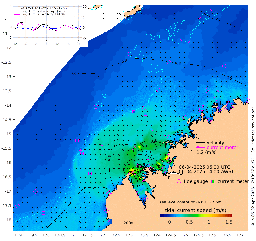 6cm/s 92T +10cm/s rms + 1cm/s 1T. NWSBRW 205m 10cm/s 123T +11cm/s rms + 6cm/s -110T. NWSROW 199m 26cm/s 137T +5cm/s rms + 2cm/s 65T. CAM050 58m 19cm/s 127T +12cm/s rms + 5cm/s 92T. CAM100 99m 4cm/s 99T +7cm/s rms + 1cm/s -85T. KIM400 396m 10cm/s 114T +9cm/s rms + 5cm/s -119T. KIM200 208m 17cm/s 117T +11cm/s rms + 5cm/s -147T. KIM100 99m 20cm/s 83T +8cm/s rms + 3cm/s -103T. KIM050 59m 5cm/s -166T +4cm/s rms + 2cm/s 23T. TIMORS88 91m 28cm Imperieuse Reef 69cm Mermaid Reef 124cm Broome 95cm Cape Baskerville 102cm Red Bluff 102cm Cape Boileau 57cm Scott Reef (WA) 62cm Ashmore Reef 42cm Karrakatta Bay 35cm Sunday Island -121cm Valentine Island -152cm Derby -95cm Port Usborne 57cm Bedford Islands 96cm Yampi Sound (Koolan Island) 50cm Macleay Island 69cm Adele Island 71cm Browse Island 84cm Shale Island 96cm Lizard Island 126cm Hall Point 102cm Degerando Island 122cm White Island 57cm Skua No. 4 Well 65cm Jabiru 100cm Maret Island 111cm Baudin Island 111cm Cape Voltaire (Krait Bay) 49cm Dillon Shoal 56cm Laminaria 125cm Port Warrender 86cm Troughton Island 99cm Cassini Island 91cm West Holothuria Reef Offshore 102cm Jar Island 80cm Lynher Bank 103cm Heywood Shoal 50cm Pee Shoal 74cm Van Cloon Shoal 102cm Carronade Island 104cm Guy Point 110cm Napier Broome Bay 99cm Lesueur Island