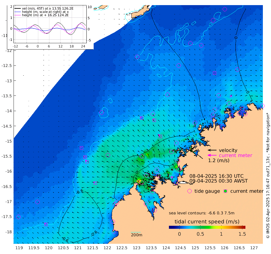 14cm/s -58T +10cm/s rms + 1cm/s 1T. NWSBRW 205m 18cm/s -48T +11cm/s rms + 6cm/s -110T. NWSROW 199m 40cm/s -41T +5cm/s rms + 2cm/s 65T. CAM050 58m 30cm/s -42T +12cm/s rms + 5cm/s 92T. CAM100 99m 8cm/s -66T +7cm/s rms + 1cm/s -85T. KIM400 396m 15cm/s -59T +9cm/s rms + 5cm/s -119T. KIM200 208m 26cm/s -52T +11cm/s rms + 5cm/s -147T. KIM100 99m 30cm/s -69T +8cm/s rms + 3cm/s -103T. KIM050 59m 5cm/s 3T +4cm/s rms + 2cm/s 23T. TIMORS88 91m 15cm Imperieuse Reef -48cm Mermaid Reef -55cm Broome -46cm Cape Baskerville -12cm Red Bluff -40cm Cape Boileau -46cm Scott Reef (WA) -31cm Ashmore Reef 24cm Karrakatta Bay 25cm Sunday Island 100cm Valentine Island 129cm Derby 93cm Port Usborne 7cm Bedford Islands -4cm Yampi Sound (Koolan Island) -37cm Macleay Island -39cm Adele Island -71cm Browse Island 22cm Shale Island -18cm Lizard Island -91cm Hall Point -16cm Degerando Island -46cm White Island -38cm Skua No. 4 Well -55cm Jabiru -46cm Maret Island -43cm Baudin Island -38cm Cape Voltaire (Krait Bay) -15cm Dillon Shoal -56cm Laminaria -31cm Port Warrender -28cm Troughton Island -35cm Cassini Island -42cm West Holothuria Reef Offshore -24cm Jar Island -45cm Lynher Bank -42cm Heywood Shoal -30cm Pee Shoal -21cm Van Cloon Shoal -30cm Carronade Island -35cm Guy Point -34cm Napier Broome Bay -20cm Lesueur Island