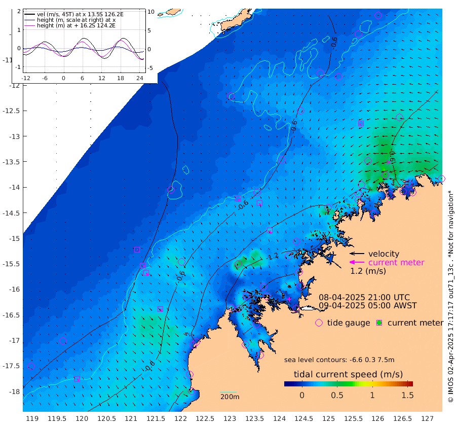 14cm/s 138T +10cm/s rms + 1cm/s 1T. NWSBRW 205m 19cm/s 151T +11cm/s rms + 6cm/s -110T. NWSROW 199m 27cm/s 157T +5cm/s rms + 2cm/s 65T. CAM050 58m 22cm/s 157T +12cm/s rms + 5cm/s 92T. CAM100 99m 5cm/s 146T +7cm/s rms + 1cm/s -85T. KIM400 396m 12cm/s 140T +9cm/s rms + 5cm/s -119T. KIM200 208m 23cm/s 150T +11cm/s rms + 5cm/s -147T. KIM100 99m 23cm/s 154T +8cm/s rms + 3cm/s -103T. KIM050 59m 16cm/s -128T +4cm/s rms + 2cm/s 23T. TIMORS88 91m -81cm Imperieuse Reef -34cm Mermaid Reef -99cm Broome -81cm Cape Baskerville -124cm Red Bluff -94cm Cape Boileau -38cm Scott Reef (WA) -59cm Ashmore Reef -158cm Karrakatta Bay -162cm Sunday Island -176cm Valentine Island -153cm Derby -160cm Port Usborne -165cm Bedford Islands -160cm Yampi Sound (Koolan Island) -170cm Macleay Island -112cm Adele Island -14cm Browse Island -194cm Shale Island -179cm Lizard Island -76cm Hall Point -140cm Degerando Island -99cm White Island -65cm Skua No. 4 Well -56cm Jabiru -92cm Maret Island -79cm Baudin Island -86cm Cape Voltaire (Krait Bay) -66cm Dillon Shoal -24cm Laminaria -106cm Port Warrender -76cm Troughton Island -91cm Cassini Island -64cm West Holothuria Reef Offshore -64cm Jar Island -64cm Lynher Bank -76cm Heywood Shoal -72cm Pee Shoal -62cm Van Cloon Shoal -41cm Carronade Island -40cm Guy Point -54cm Napier Broome Bay -15cm Lesueur Island