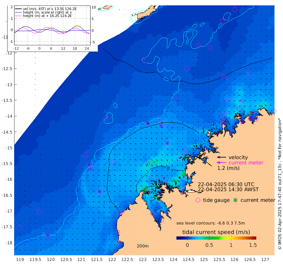 2cm/s 38T +10cm/s rms + 1cm/s 1T. NWSBRW 205m 5cm/s 124T +11cm/s rms + 6cm/s -110T. NWSROW 199m 12cm/s 139T +5cm/s rms + 2cm/s 65T. CAM050 58m 8cm/s 128T +12cm/s rms + 5cm/s 92T. CAM100 99m 2cm/s 110T +7cm/s rms + 1cm/s -85T. KIM400 396m 4cm/s 123T +9cm/s rms + 5cm/s -119T. KIM200 208m 8cm/s 126T +11cm/s rms + 5cm/s -147T. KIM100 99m 9cm/s 97T +8cm/s rms + 3cm/s -103T. KIM050 59m 3cm/s -134T +4cm/s rms + 2cm/s 23T. TIMORS88 91m 17cm Imperieuse Reef 33cm Mermaid Reef 46cm Broome 30cm Cape Baskerville 18cm Red Bluff 44cm Cape Boileau 29cm Scott Reef (WA) 25cm Ashmore Reef -6cm Karrakatta Bay -5cm Sunday Island -81cm Valentine Island -86cm Derby -59cm Port Usborne 9cm Bedford Islands 23cm Yampi Sound (Koolan Island) -25cm Macleay Island 7cm Adele Island 30cm Browse Island 12cm Shale Island 64cm Lizard Island 16cm Hall Point 35cm Degerando Island 41cm White Island 26cm Skua No. 4 Well 44cm Jabiru 37cm Maret Island 34cm Baudin Island 53cm Cape Voltaire (Krait Bay) 17cm Dillon Shoal 30cm Laminaria 54cm Port Warrender 44cm Troughton Island 38cm Cassini Island 36cm West Holothuria Reef Offshore 54cm Jar Island 41cm Lynher Bank 49cm Heywood Shoal 24cm Pee Shoal 44cm Van Cloon Shoal 64cm Carronade Island 66cm Guy Point 76cm Napier Broome Bay 81cm Lesueur Island