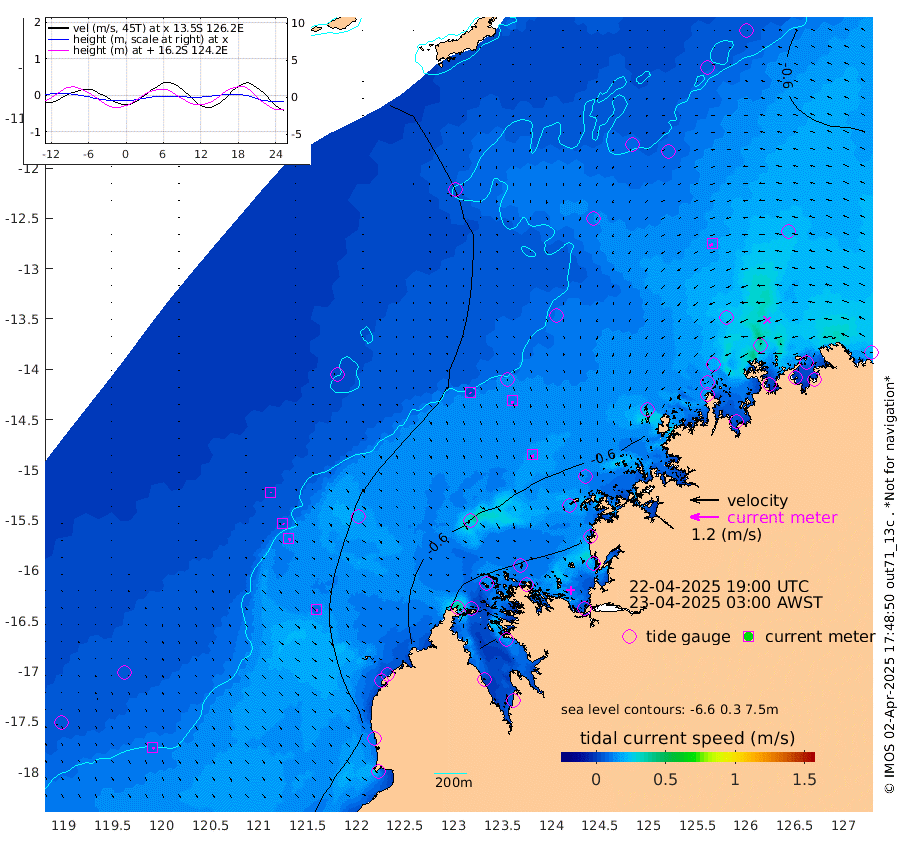 3cm/s 148T +10cm/s rms + 1cm/s 1T. NWSBRW 205m 9cm/s 149T +11cm/s rms + 6cm/s -110T. NWSROW 199m 13cm/s 167T +5cm/s rms + 2cm/s 65T. CAM050 58m 10cm/s 171T +12cm/s rms + 5cm/s 92T. CAM100 99m 3cm/s 154T +7cm/s rms + 1cm/s -85T. KIM400 396m 5cm/s 137T +9cm/s rms + 5cm/s -119T. KIM200 208m 12cm/s 149T +11cm/s rms + 5cm/s -147T. KIM100 99m 10cm/s 158T +8cm/s rms + 3cm/s -103T. KIM050 59m 14cm/s -118T +4cm/s rms + 2cm/s 23T. TIMORS88 91m -49cm Imperieuse Reef -25cm Mermaid Reef -44cm Broome -40cm Cape Baskerville -71cm Red Bluff -52cm Cape Boileau -31cm Scott Reef (WA) -46cm Ashmore Reef -86cm Karrakatta Bay -94cm Sunday Island -140cm Valentine Island -132cm Derby -113cm Port Usborne -71cm Bedford Islands -80cm Yampi Sound (Koolan Island) -116cm Macleay Island -77cm Adele Island -14cm Browse Island -94cm Shale Island -99cm Lizard Island -82cm Hall Point -66cm Degerando Island -52cm White Island -52cm Skua No. 4 Well -57cm Jabiru -53cm Maret Island -39cm Baudin Island -49cm Cape Voltaire (Krait Bay) -63cm Dillon Shoal -34cm Laminaria -63cm Port Warrender -58cm Troughton Island -60cm Cassini Island -54cm West Holothuria Reef Offshore -43cm Jar Island -34cm Lynher Bank -52cm Heywood Shoal -64cm Pee Shoal -55cm Van Cloon Shoal -38cm Carronade Island -39cm Guy Point -50cm Napier Broome Bay -18cm Lesueur Island
