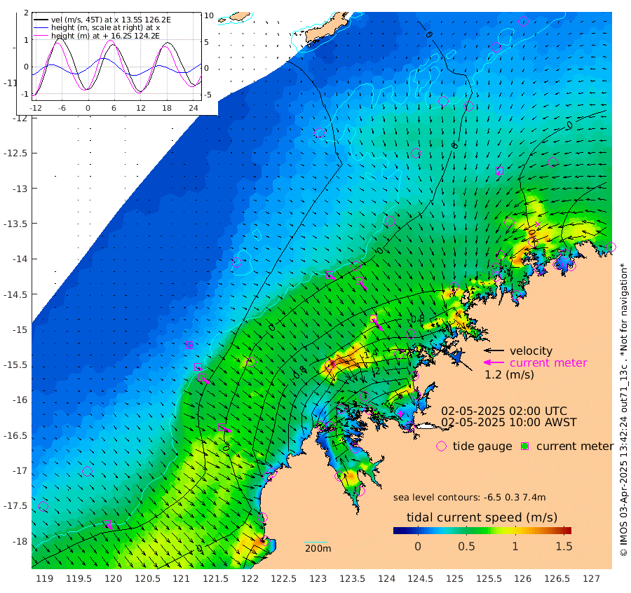 43cm/s 127T +10cm/s rms + 1cm/s 1T. NWSBRW 205m 44cm/s 141T +11cm/s rms + 6cm/s -110T. NWSROW 199m 90cm/s 143T +5cm/s rms + 2cm/s 65T. CAM050 58m 69cm/s 140T +12cm/s rms + 5cm/s 92T. CAM100 99m 12cm/s 126T +7cm/s rms + 1cm/s -85T. KIM400 396m 29cm/s 127T +9cm/s rms + 5cm/s -119T. KIM200 208m 55cm/s 135T +11cm/s rms + 5cm/s -147T. KIM100 99m 63cm/s 117T +8cm/s rms + 3cm/s -103T. KIM050 59m 28cm/s -154T +4cm/s rms + 2cm/s 23T. TIMORS88 91m -64cm Imperieuse Reef 61cm Mermaid Reef 38cm Broome 51cm Cape Baskerville -3cm Red Bluff 51cm Cape Boileau 56cm Scott Reef (WA) 35cm Ashmore Reef -159cm Karrakatta Bay -168cm Sunday Island -385cm Valentine Island -402cm Derby -354cm Port Usborne -118cm Bedford Islands -120cm Yampi Sound (Koolan Island) -128cm Macleay Island -16cm Adele Island 109cm Browse Island -222cm Shale Island -218cm Lizard Island -107cm Hall Point -45cm Degerando Island -2cm White Island 41cm Skua No. 4 Well 15cm Jabiru 41cm Maret Island 50cm Baudin Island 54cm Cape Voltaire (Krait Bay) 23cm Dillon Shoal 73cm Laminaria 41cm Port Warrender 54cm Troughton Island 62cm Cassini Island 69cm West Holothuria Reef Offshore 54cm Jar Island 29cm Lynher Bank 71cm Heywood Shoal 35cm Pee Shoal 57cm Van Cloon Shoal 99cm Carronade Island 107cm Guy Point 106cm Napier Broome Bay 125cm Lesueur Island