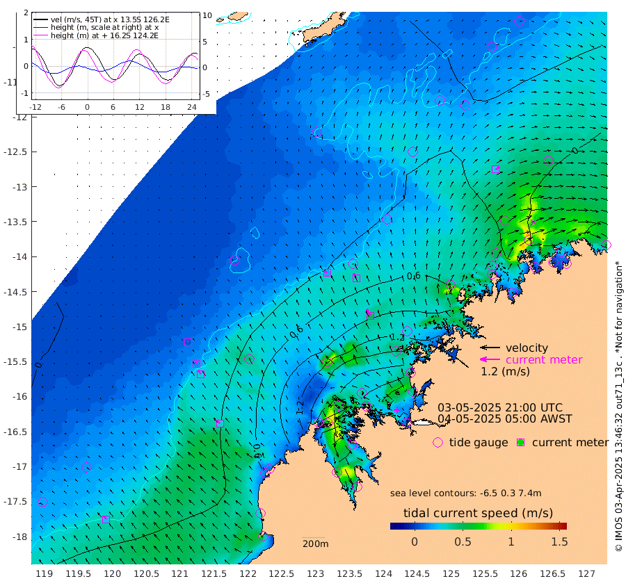 18cm/s -51T +10cm/s rms + 1cm/s 1T. NWSBRW 205m 25cm/s -36T +11cm/s rms + 6cm/s -110T. NWSROW 199m 47cm/s -26T +5cm/s rms + 2cm/s 65T. CAM050 58m 35cm/s -26T +12cm/s rms + 5cm/s 92T. CAM100 99m 5cm/s -33T +7cm/s rms + 1cm/s -85T. KIM400 396m 15cm/s -40T +9cm/s rms + 5cm/s -119T. KIM200 208m 29cm/s -37T +11cm/s rms + 5cm/s -147T. KIM100 99m 30cm/s -50T +8cm/s rms + 3cm/s -103T. KIM050 59m 27cm/s 55T +4cm/s rms + 2cm/s 23T. TIMORS88 91m 54cm Imperieuse Reef -3cm Mermaid Reef 16cm Broome 3cm Cape Baskerville 32cm Red Bluff -10cm Cape Boileau -1cm Scott Reef (WA) 12cm Ashmore Reef 131cm Karrakatta Bay 146cm Sunday Island 259cm Valentine Island 258cm Derby 245cm Port Usborne 123cm Bedford Islands 116cm Yampi Sound (Koolan Island) 138cm Macleay Island 56cm Adele Island -49cm Browse Island 184cm Shale Island 187cm Lizard Island 102cm Hall Point 63cm Degerando Island 37cm White Island 10cm Skua No. 4 Well 15cm Jabiru 12cm Maret Island 0cm Baudin Island -8cm Cape Voltaire (Krait Bay) 8cm Dillon Shoal 6cm Laminaria -6cm Port Warrender -15cm Troughton Island -12cm Cassini Island -17cm West Holothuria Reef Offshore -25cm Jar Island 22cm Lynher Bank -9cm Heywood Shoal 12cm Pee Shoal -23cm Van Cloon Shoal -59cm Carronade Island -60cm Guy Point -67cm Napier Broome Bay -89cm Lesueur Island