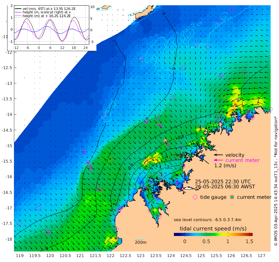 38cm/s 129T +10cm/s rms + 1cm/s 1T. NWSBRW 205m 40cm/s 141T +11cm/s rms + 6cm/s -110T. NWSROW 199m 80cm/s 143T +5cm/s rms + 2cm/s 65T. CAM050 58m 62cm/s 141T +12cm/s rms + 5cm/s 92T. CAM100 99m 12cm/s 127T +7cm/s rms + 1cm/s -85T. KIM400 396m 28cm/s 126T +9cm/s rms + 5cm/s -119T. KIM200 208m 53cm/s 134T +11cm/s rms + 5cm/s -147T. KIM100 99m 58cm/s 120T +8cm/s rms + 3cm/s -103T. KIM050 59m 24cm/s -139T +4cm/s rms + 2cm/s 23T. TIMORS88 91m -67cm Imperieuse Reef 48cm Mermaid Reef -5cm Broome 13cm Cape Baskerville -83cm Red Bluff 3cm Cape Boileau 46cm Scott Reef (WA) 16cm Ashmore Reef -179cm Karrakatta Bay -181cm Sunday Island -318cm Valentine Island -328cm Derby -290cm Port Usborne -136cm Bedford Islands -146cm Yampi Sound (Koolan Island) -140cm Macleay Island -45cm Adele Island 91cm Browse Island -232cm Shale Island -206cm Lizard Island -180cm Hall Point -82cm Degerando Island -33cm White Island 25cm Skua No. 4 Well -4cm Jabiru 5cm Maret Island 11cm Baudin Island 18cm Cape Voltaire (Krait Bay) 3cm Dillon Shoal 69cm Laminaria -1cm Port Warrender 35cm Troughton Island 20cm Cassini Island 38cm West Holothuria Reef Offshore 27cm Jar Island 17cm Lynher Bank 33cm Heywood Shoal 18cm Pee Shoal 30cm Van Cloon Shoal 72cm Carronade Island 84cm Guy Point 69cm Napier Broome Bay 115cm Lesueur Island