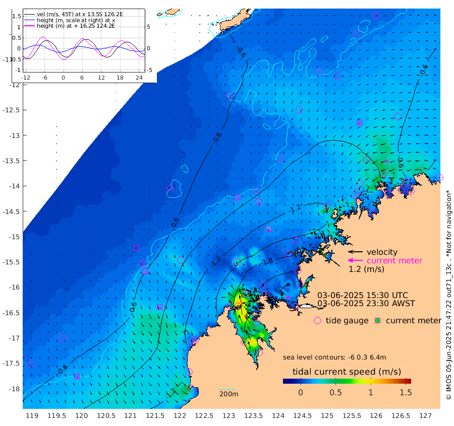 16cm/s 136T +10cm/s rms + 1cm/s 1T. NWSBRW 205m 17cm/s 158T +11cm/s rms + 6cm/s -110T. NWSROW 199m 24cm/s 160T +5cm/s rms + 2cm/s 65T. CAM050 58m 19cm/s 161T +12cm/s rms + 5cm/s 92T. CAM100 99m 4cm/s -177T +7cm/s rms + 1cm/s -85T. KIM400 396m 8cm/s 151T +9cm/s rms + 5cm/s -119T. KIM200 208m 18cm/s 156T +11cm/s rms + 5cm/s -147T. KIM100 99m 19cm/s 160T +8cm/s rms + 3cm/s -103T. KIM050 59m 18cm/s -140T +4cm/s rms + 2cm/s 23T. TIMORS88 91m -80cm Imperieuse Reef -51cm Mermaid Reef -112cm Broome -81cm Cape Baskerville -101cm Red Bluff -88cm Cape Boileau -53cm Scott Reef (WA) -66cm Ashmore Reef -158cm Karrakatta Bay -170cm Sunday Island -195cm Valentine Island -161cm Derby -182cm Port Usborne -160cm Bedford Islands -182cm Yampi Sound (Koolan Island) -206cm Macleay Island -125cm Adele Island -35cm Browse Island -228cm Shale Island -266cm Lizard Island -138cm Hall Point -143cm Degerando Island -133cm White Island -69cm Skua No. 4 Well -61cm Jabiru -100cm Maret Island -86cm Baudin Island -91cm Cape Voltaire (Krait Bay) -60cm Dillon Shoal -45cm Laminaria -113cm Port Warrender -80cm Troughton Island -83cm Cassini Island -73cm West Holothuria Reef Offshore -72cm Jar Island -87cm Lynher Bank -75cm Heywood Shoal -72cm Pee Shoal -59cm Van Cloon Shoal -47cm Carronade Island -48cm Guy Point -55cm Napier Broome Bay -18cm Lesueur Island