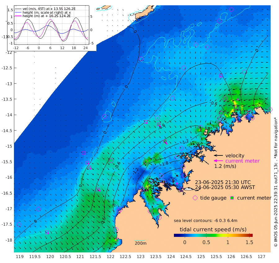30cm/s 132T +10cm/s rms + 1cm/s 1T. NWSBRW 205m 28cm/s 143T +11cm/s rms + 6cm/s -110T. NWSROW 199m 50cm/s 144T +5cm/s rms + 2cm/s 65T. CAM050 58m 41cm/s 142T +12cm/s rms + 5cm/s 92T. CAM100 99m 8cm/s 133T +7cm/s rms + 1cm/s -85T. KIM400 396m 18cm/s 133T +9cm/s rms + 5cm/s -119T. KIM200 208m 36cm/s 141T +11cm/s rms + 5cm/s -147T. KIM100 99m 39cm/s 128T +8cm/s rms + 3cm/s -103T. KIM050 59m 16cm/s -147T +4cm/s rms + 2cm/s 23T. TIMORS88 91m -59cm Imperieuse Reef 21cm Mermaid Reef -62cm Broome -32cm Cape Baskerville -100cm Red Bluff -37cm Cape Boileau 17cm Scott Reef (WA) -4cm Ashmore Reef -174cm Karrakatta Bay -160cm Sunday Island -237cm Valentine Island -217cm Derby -219cm Port Usborne -154cm Bedford Islands -162cm Yampi Sound (Koolan Island) -188cm Macleay Island -82cm Adele Island 30cm Browse Island -233cm Shale Island -210cm Lizard Island -203cm Hall Point -113cm Degerando Island -69cm White Island -4cm Skua No. 4 Well -18cm Jabiru -43cm Maret Island -27cm Baudin Island -20cm Cape Voltaire (Krait Bay) 0cm Dillon Shoal 52cm Laminaria -32cm Port Warrender 12cm Troughton Island -19cm Cassini Island 12cm West Holothuria Reef Offshore 13cm Jar Island -12cm Lynher Bank 1cm Heywood Shoal -1cm Pee Shoal 26cm Van Cloon Shoal 61cm Carronade Island 71cm Guy Point 60cm Napier Broome Bay 123cm Lesueur Island