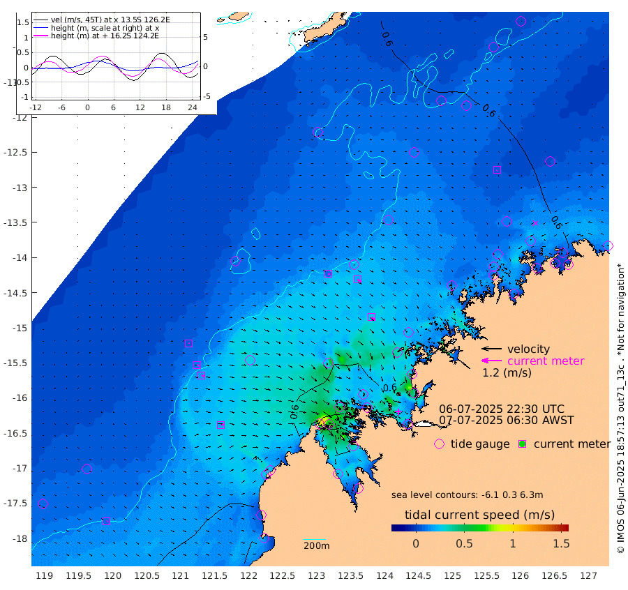 9cm/s 115T +10cm/s rms + 1cm/s 1T. NWSBRW 205m 9cm/s 120T +11cm/s rms + 6cm/s -110T. NWSROW 199m 25cm/s 129T +5cm/s rms + 2cm/s 65T. CAM050 58m 20cm/s 120T +12cm/s rms + 5cm/s 92T. CAM100 99m 5cm/s 95T +7cm/s rms + 1cm/s -85T. KIM400 396m 10cm/s 107T +9cm/s rms + 5cm/s -119T. KIM200 208m 16cm/s 107T +11cm/s rms + 5cm/s -147T. KIM100 99m 21cm/s 80T +8cm/s rms + 3cm/s -103T. KIM050 59m 5cm/s -128T +4cm/s rms + 2cm/s 23T. TIMORS88 91m 36cm Imperieuse Reef 72cm Mermaid Reef 106cm Broome 86cm Cape Baskerville 65cm Red Bluff 77cm Cape Boileau 65cm Scott Reef (WA) 77cm Ashmore Reef 59cm Karrakatta Bay 48cm Sunday Island -29cm Valentine Island -52cm Derby -13cm Port Usborne 60cm Bedford Islands 93cm Yampi Sound (Koolan Island) 107cm Macleay Island 89cm Adele Island 80cm Browse Island 91cm Shale Island 84cm Lizard Island 60cm Hall Point 84cm Degerando Island 107cm White Island 78cm Skua No. 4 Well 61cm Jabiru 101cm Maret Island 109cm Baudin Island 99cm Cape Voltaire (Krait Bay) 66cm Dillon Shoal 77cm Laminaria 99cm Port Warrender 101cm Troughton Island 103cm Cassini Island 96cm West Holothuria Reef Offshore 95cm Jar Island 76cm Lynher Bank 89cm Heywood Shoal 72cm Pee Shoal 73cm Van Cloon Shoal 88cm Carronade Island 91cm Guy Point 87cm Napier Broome Bay 88cm Lesueur Island