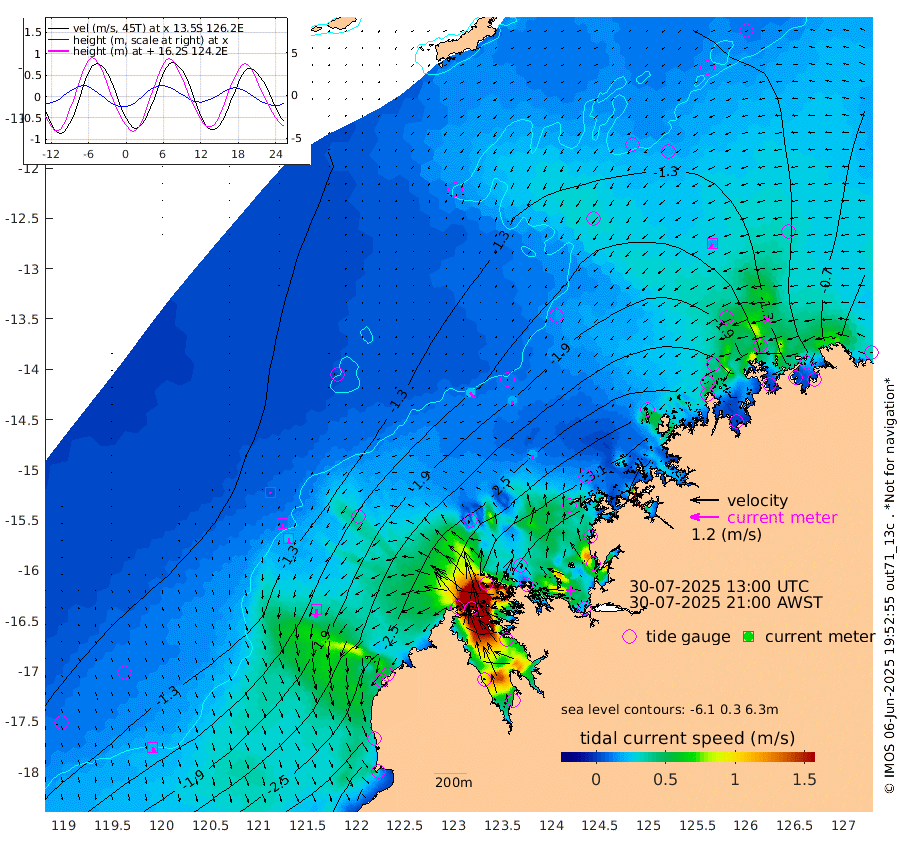 25cm/s 143T +10cm/s rms + 1cm/s 1T. NWSBRW 205m 22cm/s 164T +11cm/s rms + 6cm/s -110T. NWSROW 199m 19cm/s 174T +5cm/s rms + 2cm/s 65T. CAM050 58m 19cm/s 178T +12cm/s rms + 5cm/s 92T. CAM100 99m 6cm/s -164T +7cm/s rms + 1cm/s -85T. KIM400 396m 11cm/s -179T +9cm/s rms + 5cm/s -119T. KIM200 208m 25cm/s 178T +11cm/s rms + 5cm/s -147T. KIM100 99m 35cm/s -176T +8cm/s rms + 3cm/s -103T. KIM050 59m 19cm/s -152T +4cm/s rms + 2cm/s 23T. TIMORS88 91m -132cm Imperieuse Reef -109cm Mermaid Reef -285cm Broome -199cm Cape Baskerville -257cm Red Bluff -204cm Cape Boileau -98cm Scott Reef (WA) -127cm Ashmore Reef -289cm Karrakatta Bay -277cm Sunday Island -182cm Valentine Island -91cm Derby -194cm Port Usborne -311cm Bedford Islands -379cm Yampi Sound (Koolan Island) -382cm Macleay Island -249cm Adele Island -101cm Browse Island -457cm Shale Island -485cm Lizard Island -333cm Hall Point -318cm Degerando Island -302cm White Island -125cm Skua No. 4 Well -89cm Jabiru -234cm Maret Island -209cm Baudin Island -218cm Cape Voltaire (Krait Bay) -92cm Dillon Shoal -63cm Laminaria -257cm Port Warrender -149cm Troughton Island -195cm Cassini Island -148cm West Holothuria Reef Offshore -151cm Jar Island -175cm Lynher Bank -175cm Heywood Shoal -114cm Pee Shoal -92cm Van Cloon Shoal -93cm Carronade Island -89cm Guy Point -99cm Napier Broome Bay -3cm Lesueur Island