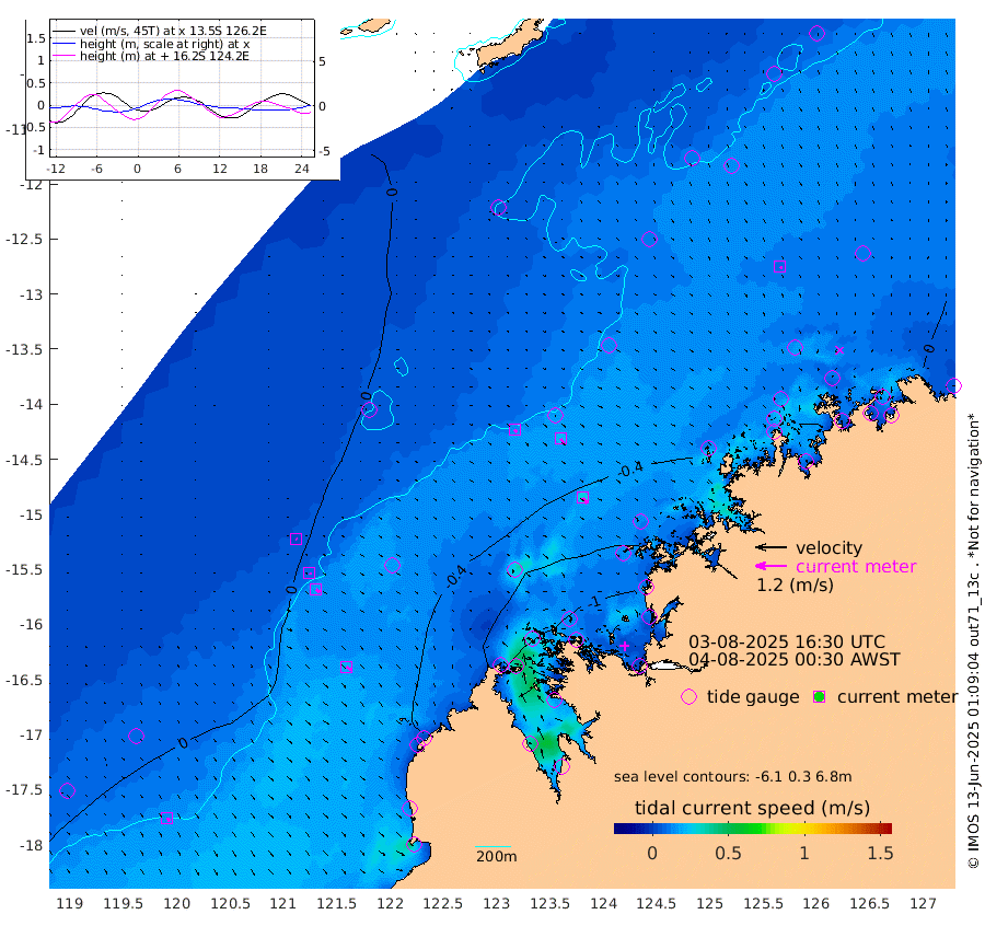 13cm/s 128T +10cm/s rms + 1cm/s 1T. NWSBRW 205m 14cm/s 147T +11cm/s rms + 6cm/s -110T. NWSROW 199m 28cm/s 139T +5cm/s rms + 2cm/s 65T. CAM050 58m 22cm/s 139T +12cm/s rms + 5cm/s 92T. CAM100 99m 3cm/s 136T +7cm/s rms + 1cm/s -85T. KIM400 396m 8cm/s 124T +9cm/s rms + 5cm/s -119T. KIM200 208m 18cm/s 134T +11cm/s rms + 5cm/s -147T. KIM100 99m 20cm/s 120T +8cm/s rms + 3cm/s -103T. KIM050 59m 10cm/s 117T +4cm/s rms + 2cm/s 23T. TIMORS88 91m -23cm Imperieuse Reef 13cm Mermaid Reef -3cm Broome 15cm Cape Baskerville -2cm Red Bluff 4cm Cape Boileau 11cm Scott Reef (WA) 2cm Ashmore Reef -58cm Karrakatta Bay -66cm Sunday Island -128cm Valentine Island -141cm Derby -125cm Port Usborne -29cm Bedford Islands -62cm Yampi Sound (Koolan Island) -82cm Macleay Island -25cm Adele Island 12cm Browse Island -94cm Shale Island -119cm Lizard Island -60cm Hall Point -24cm Degerando Island -32cm White Island 7cm Skua No. 4 Well 6cm Jabiru -2cm Maret Island 3cm Baudin Island 1cm Cape Voltaire (Krait Bay) -2cm Dillon Shoal 23cm Laminaria -8cm Port Warrender 3cm Troughton Island 9cm Cassini Island 3cm West Holothuria Reef Offshore -3cm Jar Island -1cm Lynher Bank 15cm Heywood Shoal 6cm Pee Shoal 6cm Van Cloon Shoal 11cm Carronade Island 15cm Guy Point 10cm Napier Broome Bay 30cm Lesueur Island