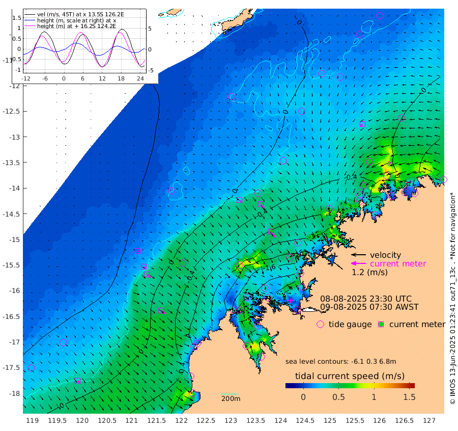 29cm/s 127T +10cm/s rms + 1cm/s 1T. NWSBRW 205m 31cm/s 144T +11cm/s rms + 6cm/s -110T. NWSROW 199m 59cm/s 143T +5cm/s rms + 2cm/s 65T. CAM050 58m 46cm/s 142T +12cm/s rms + 5cm/s 92T. CAM100 99m 10cm/s 130T +7cm/s rms + 1cm/s -85T. KIM400 396m 20cm/s 132T +9cm/s rms + 5cm/s -119T. KIM200 208m 38cm/s 138T +11cm/s rms + 5cm/s -147T. KIM100 99m 43cm/s 127T +8cm/s rms + 3cm/s -103T. KIM050 59m 24cm/s -135T +4cm/s rms + 2cm/s 23T. TIMORS88 91m -53cm Imperieuse Reef 28cm Mermaid Reef -42cm Broome -19cm Cape Baskerville -95cm Red Bluff -15cm Cape Boileau 30cm Scott Reef (WA) 8cm Ashmore Reef -160cm Karrakatta Bay -165cm Sunday Island -240cm Valentine Island -230cm Derby -223cm Port Usborne -144cm Bedford Islands -160cm Yampi Sound (Koolan Island) -155cm Macleay Island -66cm Adele Island 58cm Browse Island -233cm Shale Island -177cm Lizard Island -162cm Hall Point -105cm Degerando Island -70cm White Island 19cm Skua No. 4 Well 22cm Jabiru -19cm Maret Island -20cm Baudin Island -8cm Cape Voltaire (Krait Bay) 0cm Dillon Shoal 57cm Laminaria -35cm Port Warrender 21cm Troughton Island -2cm Cassini Island 15cm West Holothuria Reef Offshore 12cm Jar Island -5cm Lynher Bank 10cm Heywood Shoal 17cm Pee Shoal 30cm Van Cloon Shoal 57cm Carronade Island 63cm Guy Point 66cm Napier Broome Bay 105cm Lesueur Island