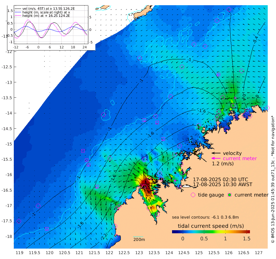 16cm/s 156T +10cm/s rms + 1cm/s 1T. NWSBRW 205m 13cm/s 171T +11cm/s rms + 6cm/s -110T. NWSROW 199m 13cm/s -162T +5cm/s rms + 2cm/s 65T. CAM050 58m 15cm/s -161T +12cm/s rms + 5cm/s 92T. CAM100 99m 5cm/s -144T +7cm/s rms + 1cm/s -85T. KIM400 396m 8cm/s -147T +9cm/s rms + 5cm/s -119T. KIM200 208m 15cm/s -159T +11cm/s rms + 5cm/s -147T. KIM100 99m 28cm/s -167T +8cm/s rms + 3cm/s -103T. KIM050 59m 19cm/s -112T +4cm/s rms + 2cm/s 23T. TIMORS88 91m -101cm Imperieuse Reef -96cm Mermaid Reef -217cm Broome -151cm Cape Baskerville -172cm Red Bluff -145cm Cape Boileau -88cm Scott Reef (WA) -100cm Ashmore Reef -219cm Karrakatta Bay -218cm Sunday Island -126cm Valentine Island -77cm Derby -158cm Port Usborne -245cm Bedford Islands -285cm Yampi Sound (Koolan Island) -286cm Macleay Island -185cm Adele Island -64cm Browse Island -346cm Shale Island -352cm Lizard Island -184cm Hall Point -232cm Degerando Island -218cm White Island -107cm Skua No. 4 Well -89cm Jabiru -168cm Maret Island -149cm Baudin Island -156cm Cape Voltaire (Krait Bay) -82cm Dillon Shoal -81cm Laminaria -161cm Port Warrender -94cm Troughton Island -134cm Cassini Island -99cm West Holothuria Reef Offshore -94cm Jar Island -141cm Lynher Bank -148cm Heywood Shoal -88cm Pee Shoal -52cm Van Cloon Shoal -44cm Carronade Island -51cm Guy Point -41cm Napier Broome Bay 29cm Lesueur Island