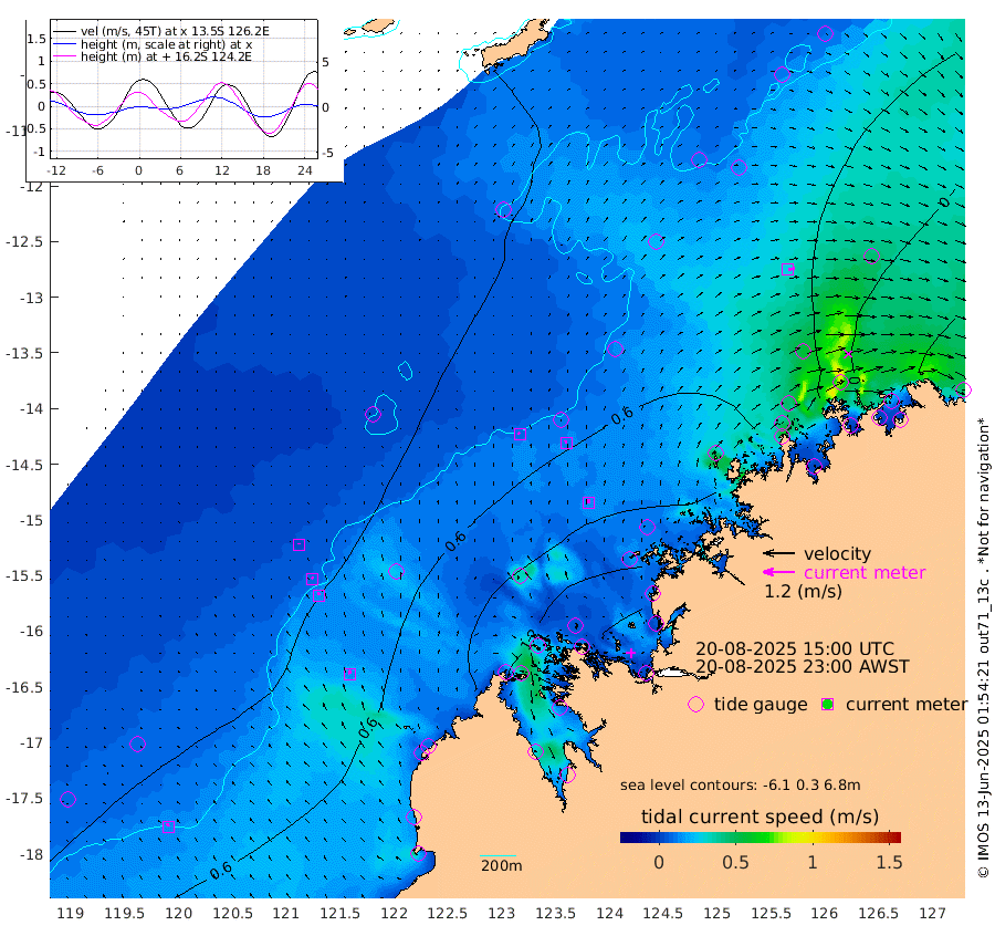 9cm/s -37T +10cm/s rms + 1cm/s 1T. NWSBRW 205m 13cm/s -28T +11cm/s rms + 6cm/s -110T. NWSROW 199m 15cm/s -2T +5cm/s rms + 2cm/s 65T. CAM050 58m 12cm/s -6T +12cm/s rms + 5cm/s 92T. CAM100 99m 3cm/s -5T +7cm/s rms + 1cm/s -85T. KIM400 396m 8cm/s -22T +9cm/s rms + 5cm/s -119T. KIM200 208m 13cm/s -18T +11cm/s rms + 5cm/s -147T. KIM100 99m 15cm/s -7T +8cm/s rms + 3cm/s -103T. KIM050 59m 27cm/s 74T +4cm/s rms + 2cm/s 23T. TIMORS88 91m 46cm Imperieuse Reef 26cm Mermaid Reef 85cm Broome 68cm Cape Baskerville 111cm Red Bluff 57cm Cape Boileau 27cm Scott Reef (WA) 41cm Ashmore Reef 130cm Karrakatta Bay 124cm Sunday Island 123cm Valentine Island 96cm Derby 117cm Port Usborne 143cm Bedford Islands 127cm Yampi Sound (Koolan Island) 160cm Macleay Island 99cm Adele Island 6cm Browse Island 163cm Shale Island 125cm Lizard Island 146cm Hall Point 108cm Degerando Island 69cm White Island 46cm Skua No. 4 Well 47cm Jabiru 70cm Maret Island 52cm Baudin Island 46cm Cape Voltaire (Krait Bay) 34cm Dillon Shoal 24cm Laminaria 44cm Port Warrender 17cm Troughton Island 55cm Cassini Island 25cm West Holothuria Reef Offshore 2cm Jar Island 45cm Lynher Bank 49cm Heywood Shoal 45cm Pee Shoal 3cm Van Cloon Shoal -30cm Carronade Island -32cm Guy Point -31cm Napier Broome Bay -85cm Lesueur Island