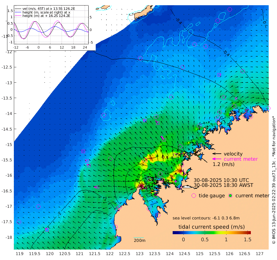 19cm/s -56T +10cm/s rms + 1cm/s 1T. NWSBRW 205m 21cm/s -53T +11cm/s rms + 6cm/s -110T. NWSROW 199m 62cm/s -35T +5cm/s rms + 2cm/s 65T. CAM050 58m 44cm/s -39T +12cm/s rms + 5cm/s 92T. CAM100 99m 8cm/s -71T +7cm/s rms + 1cm/s -85T. KIM400 396m 19cm/s -67T +9cm/s rms + 5cm/s -119T. KIM200 208m 34cm/s -60T +11cm/s rms + 5cm/s -147T. KIM100 99m 44cm/s -86T +8cm/s rms + 3cm/s -103T. KIM050 59m 16cm/s 64T +4cm/s rms + 2cm/s 23T. TIMORS88 91m -13cm Imperieuse Reef -87cm Mermaid Reef -186cm Broome -139cm Cape Baskerville -117cm Red Bluff -141cm Cape Boileau -77cm Scott Reef (WA) -79cm Ashmore Reef -26cm Karrakatta Bay 13cm Sunday Island 260cm Valentine Island 313cm Derby 198cm Port Usborne -69cm Bedford Islands -101cm Yampi Sound (Koolan Island) -94cm Macleay Island -105cm Adele Island -144cm Browse Island -75cm Shale Island -64cm Lizard Island -86cm Hall Point -138cm Degerando Island -144cm White Island -85cm Skua No. 4 Well -45cm Jabiru -153cm Maret Island -145cm Baudin Island -153cm Cape Voltaire (Krait Bay) -44cm Dillon Shoal -52cm Laminaria -149cm Port Warrender -108cm Troughton Island -151cm Cassini Island -110cm West Holothuria Reef Offshore -111cm Jar Island -97cm Lynher Bank -128cm Heywood Shoal -64cm Pee Shoal -68cm Van Cloon Shoal -105cm Carronade Island -102cm Guy Point -113cm Napier Broome Bay -74cm Lesueur Island