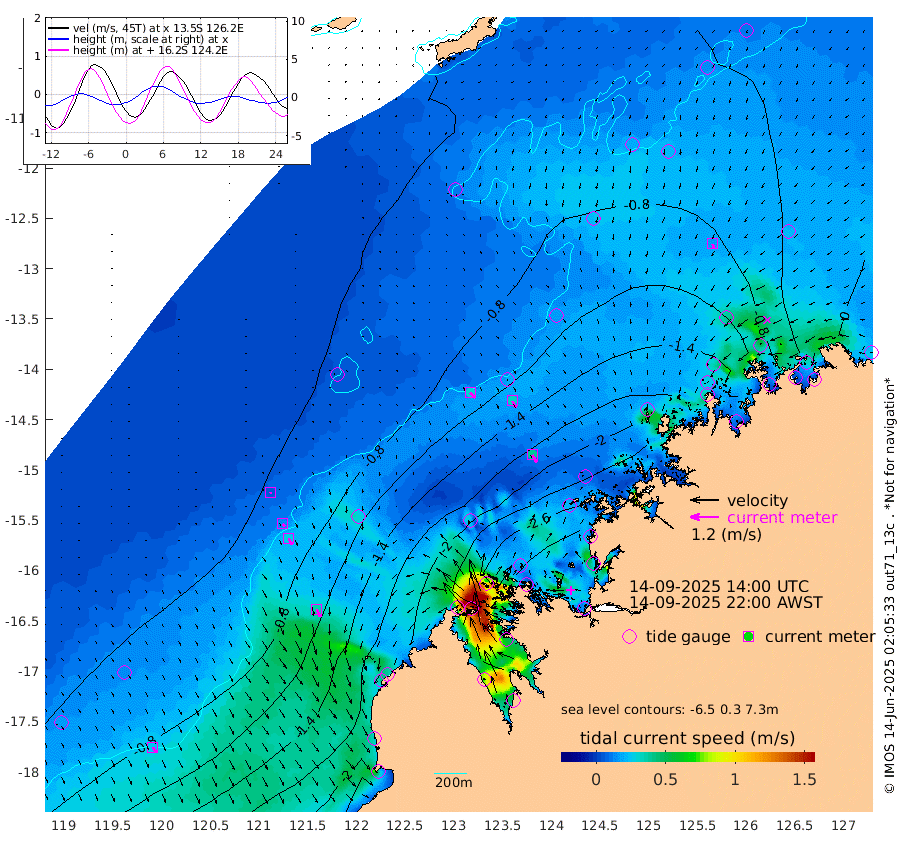 30cm/s 137T +10cm/s rms + 1cm/s 1T. NWSBRW 205m 26cm/s 152T +11cm/s rms + 6cm/s -110T. NWSROW 199m 38cm/s 147T +5cm/s rms + 2cm/s 65T. CAM050 58m 32cm/s 151T +12cm/s rms + 5cm/s 92T. CAM100 99m 6cm/s 159T +7cm/s rms + 1cm/s -85T. KIM400 396m 13cm/s 152T +9cm/s rms + 5cm/s -119T. KIM200 208m 29cm/s 156T +11cm/s rms + 5cm/s -147T. KIM100 99m 36cm/s 151T +8cm/s rms + 3cm/s -103T. KIM050 59m 16cm/s 163T +4cm/s rms + 2cm/s 23T. TIMORS88 91m -97cm Imperieuse Reef -40cm Mermaid Reef -161cm Broome -98cm Cape Baskerville -129cm Red Bluff -101cm Cape Boileau -35cm Scott Reef (WA) -55cm Ashmore Reef -222cm Karrakatta Bay -210cm Sunday Island -219cm Valentine Island -171cm Derby -229cm Port Usborne -224cm Bedford Islands -268cm Yampi Sound (Koolan Island) -272cm Macleay Island -145cm Adele Island -33cm Browse Island -351cm Shale Island -373cm Lizard Island -198cm Hall Point -202cm Degerando Island -183cm White Island -54cm Skua No. 4 Well -40cm Jabiru -125cm Maret Island -109cm Baudin Island -110cm Cape Voltaire (Krait Bay) -31cm Dillon Shoal 2cm Laminaria -132cm Port Warrender -66cm Troughton Island -88cm Cassini Island -54cm West Holothuria Reef Offshore -70cm Jar Island -93cm Lynher Bank -70cm Heywood Shoal -40cm Pee Shoal -21cm Van Cloon Shoal -14cm Carronade Island -9cm Guy Point -13cm Napier Broome Bay 43cm Lesueur Island