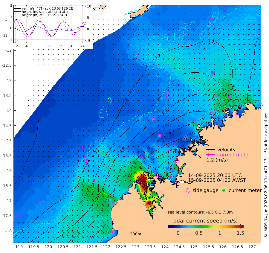 20cm/s -36T +10cm/s rms + 1cm/s 1T. NWSBRW 205m 22cm/s -22T +11cm/s rms + 6cm/s -110T. NWSROW 199m 29cm/s -23T +5cm/s rms + 2cm/s 65T. CAM050 58m 25cm/s -12T +12cm/s rms + 5cm/s 92T. CAM100 99m 6cm/s -1T +7cm/s rms + 1cm/s -85T. KIM400 396m 10cm/s -7T +9cm/s rms + 5cm/s -119T. KIM200 208m 23cm/s -9T +11cm/s rms + 5cm/s -147T. KIM100 99m 35cm/s -10T +8cm/s rms + 3cm/s -103T. KIM050 59m 18cm/s 27T +4cm/s rms + 2cm/s 23T. TIMORS88 91m 139cm Imperieuse Reef 99cm Mermaid Reef 223cm Broome 156cm Cape Baskerville 172cm Red Bluff 162cm Cape Boileau 94cm Scott Reef (WA) 121cm Ashmore Reef 258cm Karrakatta Bay 257cm Sunday Island 228cm Valentine Island 181cm Derby 243cm Port Usborne 268cm Bedford Islands 322cm Yampi Sound (Koolan Island) 320cm Macleay Island 202cm Adele Island 73cm Browse Island 396cm Shale Island 423cm Lizard Island 260cm Hall Point 261cm Degerando Island 245cm White Island 124cm Skua No. 4 Well 134cm Jabiru 193cm Maret Island 175cm Baudin Island 188cm Cape Voltaire (Krait Bay) 109cm Dillon Shoal 78cm Laminaria 214cm Port Warrender 158cm Troughton Island 168cm Cassini Island 134cm West Holothuria Reef Offshore 151cm Jar Island 155cm Lynher Bank 156cm Heywood Shoal 117cm Pee Shoal 103cm Van Cloon Shoal 106cm Carronade Island 109cm Guy Point 110cm Napier Broome Bay 65cm Lesueur Island