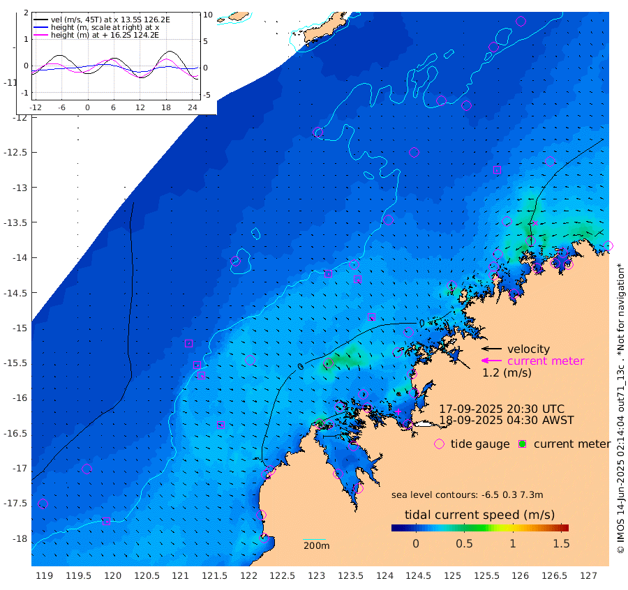 8cm/s 123T +10cm/s rms + 1cm/s 1T. NWSBRW 205m 10cm/s 141T +11cm/s rms + 6cm/s -110T. NWSROW 199m 17cm/s 143T +5cm/s rms + 2cm/s 65T. CAM050 58m 14cm/s 135T +12cm/s rms + 5cm/s 92T. CAM100 99m 3cm/s 121T +7cm/s rms + 1cm/s -85T. KIM400 396m 8cm/s 132T +9cm/s rms + 5cm/s -119T. KIM200 208m 14cm/s 140T +11cm/s rms + 5cm/s -147T. KIM100 99m 13cm/s 119T +8cm/s rms + 3cm/s -103T. KIM050 59m 7cm/s -120T +4cm/s rms + 2cm/s 23T. TIMORS88 91m -5cm Imperieuse Reef 27cm Mermaid Reef 5cm Broome 4cm Cape Baskerville -19cm Red Bluff 12cm Cape Boileau 21cm Scott Reef (WA) 14cm Ashmore Reef -40cm Karrakatta Bay -29cm Sunday Island -88cm Valentine Island -76cm Derby -72cm Port Usborne -45cm Bedford Islands -22cm Yampi Sound (Koolan Island) -54cm Macleay Island -16cm Adele Island 21cm Browse Island -43cm Shale Island -8cm Lizard Island 18cm Hall Point -16cm Degerando Island 17cm White Island 10cm Skua No. 4 Well 40cm Jabiru 4cm Maret Island 19cm Baudin Island 20cm Cape Voltaire (Krait Bay) 18cm Dillon Shoal 38cm Laminaria 22cm Port Warrender 28cm Troughton Island 9cm Cassini Island 30cm West Holothuria Reef Offshore 42cm Jar Island 21cm Lynher Bank 26cm Heywood Shoal 9cm Pee Shoal 38cm Van Cloon Shoal 60cm Carronade Island 66cm Guy Point 67cm Napier Broome Bay 91cm Lesueur Island