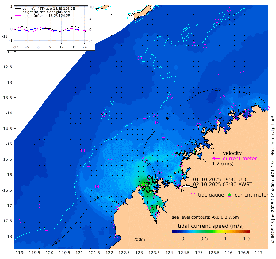 5cm/s -30T +10cm/s rms + 1cm/s 1T. NWSBRW 205m 2cm/s 14T +11cm/s rms + 6cm/s -110T. NWSROW 199m 2cm/s 42T +5cm/s rms + 2cm/s 65T. CAM050 58m 4cm/s 45T +12cm/s rms + 5cm/s 92T. CAM100 99m 1cm/s 45T +7cm/s rms + 1cm/s -85T. KIM400 396m 2cm/s 69T +9cm/s rms + 5cm/s -119T. KIM200 208m 3cm/s 63T +11cm/s rms + 5cm/s -147T. KIM100 99m 6cm/s 25T +8cm/s rms + 3cm/s -103T. KIM050 59m 3cm/s -1T +4cm/s rms + 2cm/s 23T. TIMORS88 91m 44cm Imperieuse Reef 42cm Mermaid Reef 68cm Broome 49cm Cape Baskerville 43cm Red Bluff 55cm Cape Boileau 36cm Scott Reef (WA) 45cm Ashmore Reef 54cm Karrakatta Bay 43cm Sunday Island 11cm Valentine Island -7cm Derby 19cm Port Usborne 52cm Bedford Islands 75cm Yampi Sound (Koolan Island) 39cm Macleay Island 39cm Adele Island 31cm Browse Island 90cm Shale Island 128cm Lizard Island 59cm Hall Point 66cm Degerando Island 69cm White Island 47cm Skua No. 4 Well 65cm Jabiru 61cm Maret Island 61cm Baudin Island 70cm Cape Voltaire (Krait Bay) 36cm Dillon Shoal 41cm Laminaria 71cm Port Warrender 69cm Troughton Island 61cm Cassini Island 52cm West Holothuria Reef Offshore 73cm Jar Island 52cm Lynher Bank 61cm Heywood Shoal 44cm Pee Shoal 56cm Van Cloon Shoal 68cm Carronade Island 68cm Guy Point 76cm Napier Broome Bay 81cm Lesueur Island