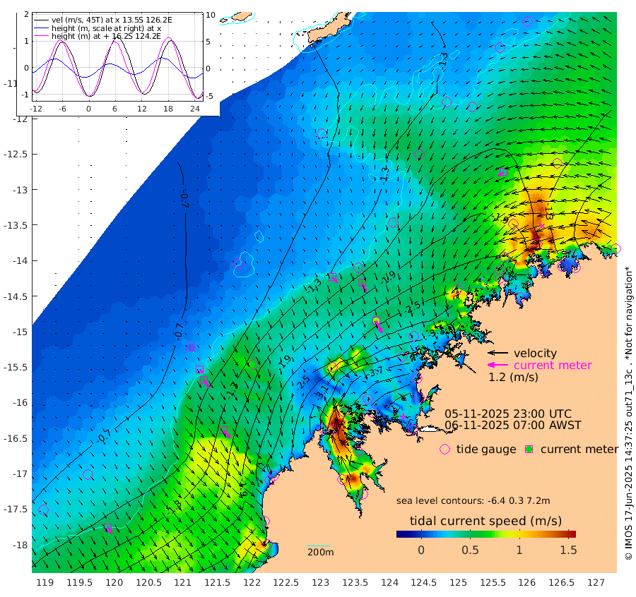 42cm/s 138T +10cm/s rms + 1cm/s 1T. NWSBRW 205m 44cm/s 149T +11cm/s rms + 6cm/s -110T. NWSROW 199m 78cm/s 153T +5cm/s rms + 2cm/s 65T. CAM050 58m 60cm/s 156T +12cm/s rms + 5cm/s 92T. CAM100 99m 12cm/s 148T +7cm/s rms + 1cm/s -85T. KIM400 396m 26cm/s 142T +9cm/s rms + 5cm/s -119T. KIM200 208m 52cm/s 150T +11cm/s rms + 5cm/s -147T. KIM100 99m 62cm/s 141T +8cm/s rms + 3cm/s -103T. KIM050 59m 41cm/s -125T +4cm/s rms + 2cm/s 23T. TIMORS88 91m -179cm Imperieuse Reef -70cm Mermaid Reef -190cm Broome -141cm Cape Baskerville -228cm Red Bluff -136cm Cape Boileau -66cm Scott Reef (WA) -126cm Ashmore Reef -353cm Karrakatta Bay -348cm Sunday Island -446cm Valentine Island -409cm Derby -418cm Port Usborne -329cm Bedford Islands -367cm Yampi Sound (Koolan Island) -364cm Macleay Island -219cm Adele Island 4cm Browse Island -484cm Shale Island -449cm Lizard Island -347cm Hall Point -278cm Degerando Island -224cm White Island -119cm Skua No. 4 Well -129cm Jabiru -181cm Maret Island -164cm Baudin Island -163cm Cape Voltaire (Krait Bay) -129cm Dillon Shoal -62cm Laminaria -199cm Port Warrender -150cm Troughton Island -162cm Cassini Island -120cm West Holothuria Reef Offshore -134cm Jar Island -128cm Lynher Bank -137cm Heywood Shoal -129cm Pee Shoal -102cm Van Cloon Shoal -70cm Carronade Island -68cm Guy Point -67cm Napier Broome Bay -20cm Lesueur Island