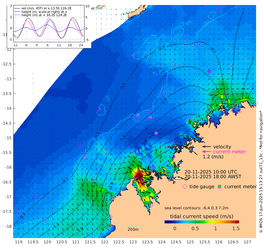27cm/s 140T +10cm/s rms + 1cm/s 1T. NWSBRW 205m 22cm/s 153T +11cm/s rms + 6cm/s -110T. NWSROW 199m 27cm/s 151T +5cm/s rms + 2cm/s 65T. CAM050 58m 26cm/s 155T +12cm/s rms + 5cm/s 92T. CAM100 99m 6cm/s 165T +7cm/s rms + 1cm/s -85T. KIM400 396m 11cm/s 159T +9cm/s rms + 5cm/s -119T. KIM200 208m 26cm/s 163T +11cm/s rms + 5cm/s -147T. KIM100 99m 33cm/s 160T +8cm/s rms + 3cm/s -103T. KIM050 59m 12cm/s -164T +4cm/s rms + 2cm/s 23T. TIMORS88 91m -91cm Imperieuse Reef -50cm Mermaid Reef -207cm Broome -135cm Cape Baskerville -203cm Red Bluff -145cm Cape Boileau -46cm Scott Reef (WA) -64cm Ashmore Reef -239cm Karrakatta Bay -230cm Sunday Island -182cm Valentine Island -119cm Derby -187cm Port Usborne -252cm Bedford Islands -302cm Yampi Sound (Koolan Island) -322cm Macleay Island -187cm Adele Island -52cm Browse Island -371cm Shale Island -376cm Lizard Island -338cm Hall Point -245cm Degerando Island -219cm White Island -64cm Skua No. 4 Well -65cm Jabiru -158cm Maret Island -131cm Baudin Island -137cm Cape Voltaire (Krait Bay) -45cm Dillon Shoal 4cm Laminaria -171cm Port Warrender -64cm Troughton Island -116cm Cassini Island -73cm West Holothuria Reef Offshore -70cm Jar Island -107cm Lynher Bank -103cm Heywood Shoal -51cm Pee Shoal -24cm Van Cloon Shoal -13cm Carronade Island -8cm Guy Point -16cm Napier Broome Bay 89cm Lesueur Island