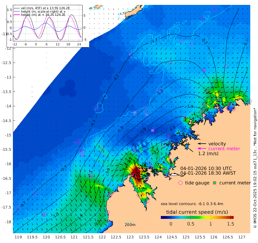 29cm/s 140T +10cm/s rms + 1cm/s 1T. NWSBRW 205m 22cm/s 155T +11cm/s rms + 6cm/s -110T. NWSROW 199m 21cm/s 155T +5cm/s rms + 2cm/s 65T. CAM050 58m 23cm/s 157T +12cm/s rms + 5cm/s 92T. CAM100 99m 6cm/s 171T +7cm/s rms + 1cm/s -85T. KIM400 396m 12cm/s 170T +9cm/s rms + 5cm/s -119T. KIM200 208m 25cm/s 172T +11cm/s rms + 5cm/s -147T. KIM100 99m 33cm/s 169T +8cm/s rms + 3cm/s -103T. KIM050 59m 18cm/s -155T +4cm/s rms + 2cm/s 23T. TIMORS88 91m -101cm Imperieuse Reef -58cm Mermaid Reef -237cm Broome -160cm Cape Baskerville -208cm Red Bluff -159cm Cape Boileau -56cm Scott Reef (WA) -75cm Ashmore Reef -269cm Karrakatta Bay -238cm Sunday Island -190cm Valentine Island -110cm Derby -202cm Port Usborne -290cm Bedford Islands -324cm Yampi Sound (Koolan Island) -366cm Macleay Island -209cm Adele Island -71cm Browse Island -410cm Shale Island -388cm Lizard Island -344cm Hall Point -273cm Degerando Island -228cm White Island -84cm Skua No. 4 Well -71cm Jabiru -182cm Maret Island -151cm Baudin Island -152cm Cape Voltaire (Krait Bay) -47cm Dillon Shoal 0cm Laminaria -172cm Port Warrender -76cm Troughton Island -138cm Cassini Island -75cm West Holothuria Reef Offshore -68cm Jar Island -117cm Lynher Bank -114cm Heywood Shoal -63cm Pee Shoal -15cm Van Cloon Shoal 3cm Carronade Island 7cm Guy Point 5cm Napier Broome Bay 112cm Lesueur Island