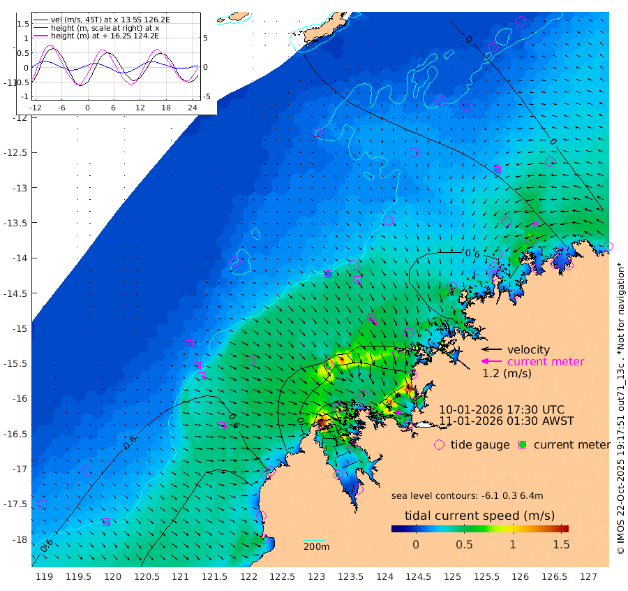 10cm/s 125T +10cm/s rms + 1cm/s 1T. NWSBRW 205m 20cm/s 132T +11cm/s rms + 6cm/s -110T. NWSROW 199m 54cm/s 146T +5cm/s rms + 2cm/s 65T. CAM050 58m 37cm/s 144T +12cm/s rms + 5cm/s 92T. CAM100 99m 7cm/s 115T +7cm/s rms + 1cm/s -85T. KIM400 396m 15cm/s 118T +9cm/s rms + 5cm/s -119T. KIM200 208m 29cm/s 126T +11cm/s rms + 5cm/s -147T. KIM100 99m 36cm/s 102T +8cm/s rms + 3cm/s -103T. KIM050 59m 14cm/s -114T +4cm/s rms + 2cm/s 23T. TIMORS88 91m -17cm Imperieuse Reef 53cm Mermaid Reef 131cm Broome 97cm Cape Baskerville 101cm Red Bluff 103cm Cape Boileau 43cm Scott Reef (WA) 36cm Ashmore Reef -3cm Karrakatta Bay -43cm Sunday Island -239cm Valentine Island -307cm Derby -212cm Port Usborne 17cm Bedford Islands 53cm Yampi Sound (Koolan Island) 40cm Macleay Island 57cm Adele Island 106cm Browse Island 30cm Shale Island 49cm Lizard Island 137cm Hall Point 82cm Degerando Island 103cm White Island 38cm Skua No. 4 Well 11cm Jabiru 96cm Maret Island 96cm Baudin Island 93cm Cape Voltaire (Krait Bay) 1cm Dillon Shoal 17cm Laminaria 97cm Port Warrender 45cm Troughton Island 86cm Cassini Island 63cm West Holothuria Reef Offshore 61cm Jar Island 57cm Lynher Bank 79cm Heywood Shoal 19cm Pee Shoal 27cm Van Cloon Shoal 57cm Carronade Island 53cm Guy Point 66cm Napier Broome Bay 18cm Lesueur Island