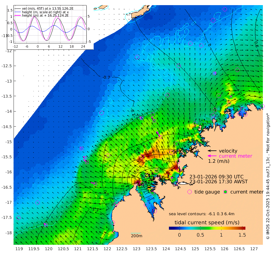31cm/s -56T +10cm/s rms + 1cm/s 1T. NWSBRW 205m 39cm/s -44T +11cm/s rms + 6cm/s -110T. NWSROW 199m 95cm/s -34T +5cm/s rms + 2cm/s 65T. CAM050 58m 66cm/s -36T +12cm/s rms + 5cm/s 92T. CAM100 99m 13cm/s -62T +7cm/s rms + 1cm/s -85T. KIM400 396m 30cm/s -60T +9cm/s rms + 5cm/s -119T. KIM200 208m 57cm/s -52T +11cm/s rms + 5cm/s -147T. KIM100 99m 64cm/s -75T +8cm/s rms + 3cm/s -103T. KIM050 59m 25cm/s 47T +4cm/s rms + 2cm/s 23T. TIMORS88 91m 40cm Imperieuse Reef -85cm Mermaid Reef -169cm Broome -134cm Cape Baskerville -79cm Red Bluff -133cm Cape Boileau -79cm Scott Reef (WA) -48cm Ashmore Reef 53cm Karrakatta Bay 99cm Sunday Island 378cm Valentine Island 459cm Derby 327cm Port Usborne -11cm Bedford Islands -19cm Yampi Sound (Koolan Island) -40cm Macleay Island -69cm Adele Island -164cm Browse Island 40cm Shale Island 33cm Lizard Island -66cm Hall Point -82cm Degerando Island -102cm White Island -69cm Skua No. 4 Well -33cm Jabiru -125cm Maret Island -111cm Baudin Island -118cm Cape Voltaire (Krait Bay) -9cm Dillon Shoal -50cm Laminaria -102cm Port Warrender -55cm Troughton Island -109cm Cassini Island -75cm West Holothuria Reef Offshore -55cm Jar Island -80cm Lynher Bank -118cm Heywood Shoal -36cm Pee Shoal -19cm Van Cloon Shoal -58cm Carronade Island -67cm Guy Point -63cm Napier Broome Bay -8cm Lesueur Island