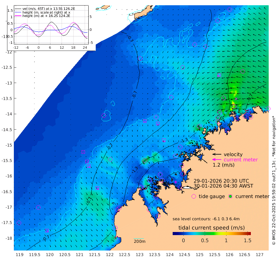 13cm/s 149T +10cm/s rms + 1cm/s 1T. NWSBRW 205m 15cm/s 150T +11cm/s rms + 6cm/s -110T. NWSROW 199m 26cm/s 171T +5cm/s rms + 2cm/s 65T. CAM050 58m 20cm/s 174T +12cm/s rms + 5cm/s 92T. CAM100 99m 4cm/s 164T +7cm/s rms + 1cm/s -85T. KIM400 396m 9cm/s 150T +9cm/s rms + 5cm/s -119T. KIM200 208m 19cm/s 159T +11cm/s rms + 5cm/s -147T. KIM100 99m 20cm/s 155T +8cm/s rms + 3cm/s -103T. KIM050 59m 27cm/s -116T +4cm/s rms + 2cm/s 23T. TIMORS88 91m -93cm Imperieuse Reef -56cm Mermaid Reef -91cm Broome -81cm Cape Baskerville -109cm Red Bluff -80cm Cape Boileau -60cm Scott Reef (WA) -91cm Ashmore Reef -160cm Karrakatta Bay -162cm Sunday Island -209cm Valentine Island -204cm Derby -194cm Port Usborne -149cm Bedford Islands -150cm Yampi Sound (Koolan Island) -183cm Macleay Island -124cm Adele Island -19cm Browse Island -188cm Shale Island -162cm Lizard Island -198cm Hall Point -126cm Degerando Island -93cm White Island -95cm Skua No. 4 Well -120cm Jabiru -105cm Maret Island -89cm Baudin Island -93cm Cape Voltaire (Krait Bay) -105cm Dillon Shoal -76cm Laminaria -101cm Port Warrender -106cm Troughton Island -107cm Cassini Island -88cm West Holothuria Reef Offshore -79cm Jar Island -73cm Lynher Bank -94cm Heywood Shoal -108cm Pee Shoal -86cm Van Cloon Shoal -62cm Carronade Island -66cm Guy Point -69cm Napier Broome Bay -46cm Lesueur Island