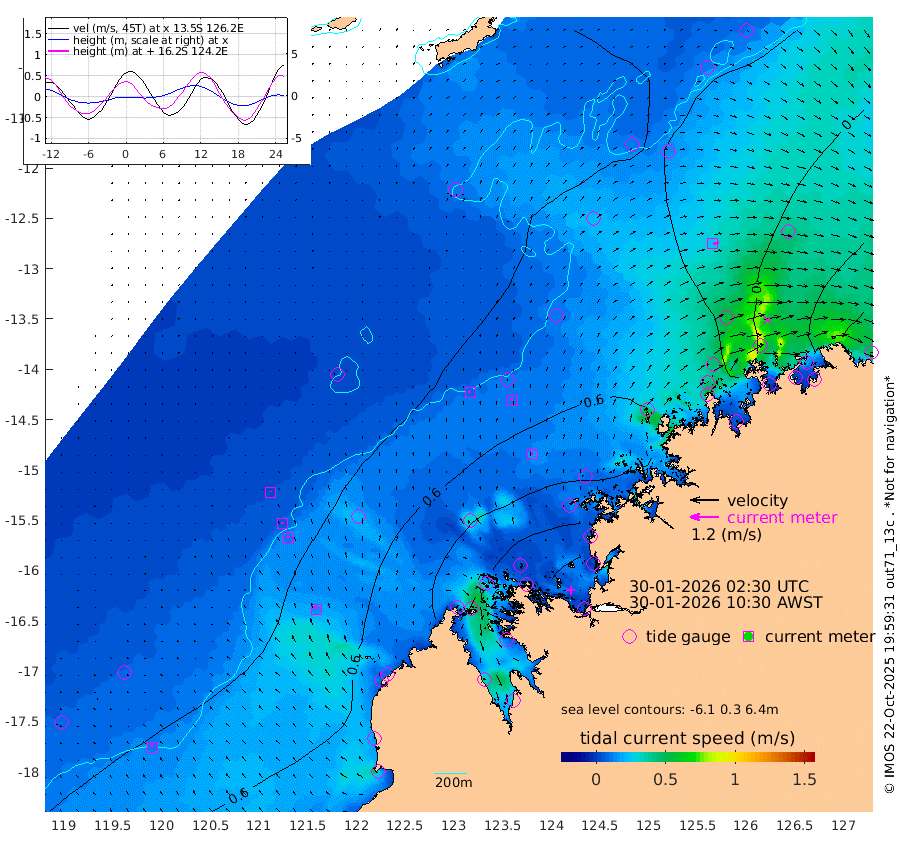 9cm/s -31T +10cm/s rms + 1cm/s 1T. NWSBRW 205m 12cm/s -29T +11cm/s rms + 6cm/s -110T. NWSROW 199m 16cm/s -12T +5cm/s rms + 2cm/s 65T. CAM050 58m 12cm/s -15T +12cm/s rms + 5cm/s 92T. CAM100 99m 3cm/s -5T +7cm/s rms + 1cm/s -85T. KIM400 396m 7cm/s -27T +9cm/s rms + 5cm/s -119T. KIM200 208m 12cm/s -25T +11cm/s rms + 5cm/s -147T. KIM100 99m 14cm/s -21T +8cm/s rms + 3cm/s -103T. KIM050 59m 25cm/s 77T +4cm/s rms + 2cm/s 23T. TIMORS88 91m 34cm Imperieuse Reef 14cm Mermaid Reef 61cm Broome 46cm Cape Baskerville 90cm Red Bluff 36cm Cape Boileau 16cm Scott Reef (WA) 27cm Ashmore Reef 116cm Karrakatta Bay 111cm Sunday Island 121cm Valentine Island 109cm Derby 119cm Port Usborne 116cm Bedford Islands 104cm Yampi Sound (Koolan Island) 144cm Macleay Island 81cm Adele Island -8cm Browse Island 140cm Shale Island 99cm Lizard Island 164cm Hall Point 80cm Degerando Island 47cm White Island 32cm Skua No. 4 Well 46cm Jabiru 46cm Maret Island 30cm Baudin Island 20cm Cape Voltaire (Krait Bay) 26cm Dillon Shoal 18cm Laminaria 11cm Port Warrender -9cm Troughton Island 29cm Cassini Island 6cm West Holothuria Reef Offshore -21cm Jar Island 27cm Lynher Bank 31cm Heywood Shoal 29cm Pee Shoal -16cm Van Cloon Shoal -53cm Carronade Island -54cm Guy Point -55cm Napier Broome Bay -112cm Lesueur Island