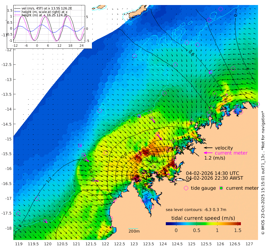 32cm/s 122T +10cm/s rms + 1cm/s 1T. NWSBRW 205m 43cm/s 135T +11cm/s rms + 6cm/s -110T. NWSROW 199m 105cm/s 142T +5cm/s rms + 2cm/s 65T. CAM050 58m 76cm/s 139T +12cm/s rms + 5cm/s 92T. CAM100 99m 16cm/s 115T +7cm/s rms + 1cm/s -85T. KIM400 396m 34cm/s 120T +9cm/s rms + 5cm/s -119T. KIM200 208m 61cm/s 126T +11cm/s rms + 5cm/s -147T. KIM100 99m 73cm/s 105T +8cm/s rms + 3cm/s -103T. KIM050 59m 26cm/s -132T +4cm/s rms + 2cm/s 23T. TIMORS88 91m -29cm Imperieuse Reef 117cm Mermaid Reef 202cm Broome 164cm Cape Baskerville 123cm Red Bluff 169cm Cape Boileau 107cm Scott Reef (WA) 86cm Ashmore Reef -32cm Karrakatta Bay -70cm Sunday Island -387cm Valentine Island -470cm Derby -337cm Port Usborne 20cm Bedford Islands 49cm Yampi Sound (Koolan Island) 83cm Macleay Island 112cm Adele Island 197cm Browse Island -21cm Shale Island -4cm Lizard Island 171cm Hall Point 108cm Degerando Island 149cm White Island 98cm Skua No. 4 Well 70cm Jabiru 166cm Maret Island 160cm Baudin Island 154cm Cape Voltaire (Krait Bay) 44cm Dillon Shoal 90cm Laminaria 149cm Port Warrender 99cm Troughton Island 150cm Cassini Island 128cm West Holothuria Reef Offshore 100cm Jar Island 112cm Lynher Bank 151cm Heywood Shoal 72cm Pee Shoal 67cm Van Cloon Shoal 110cm Carronade Island 118cm Guy Point 123cm Napier Broome Bay 62cm Lesueur Island