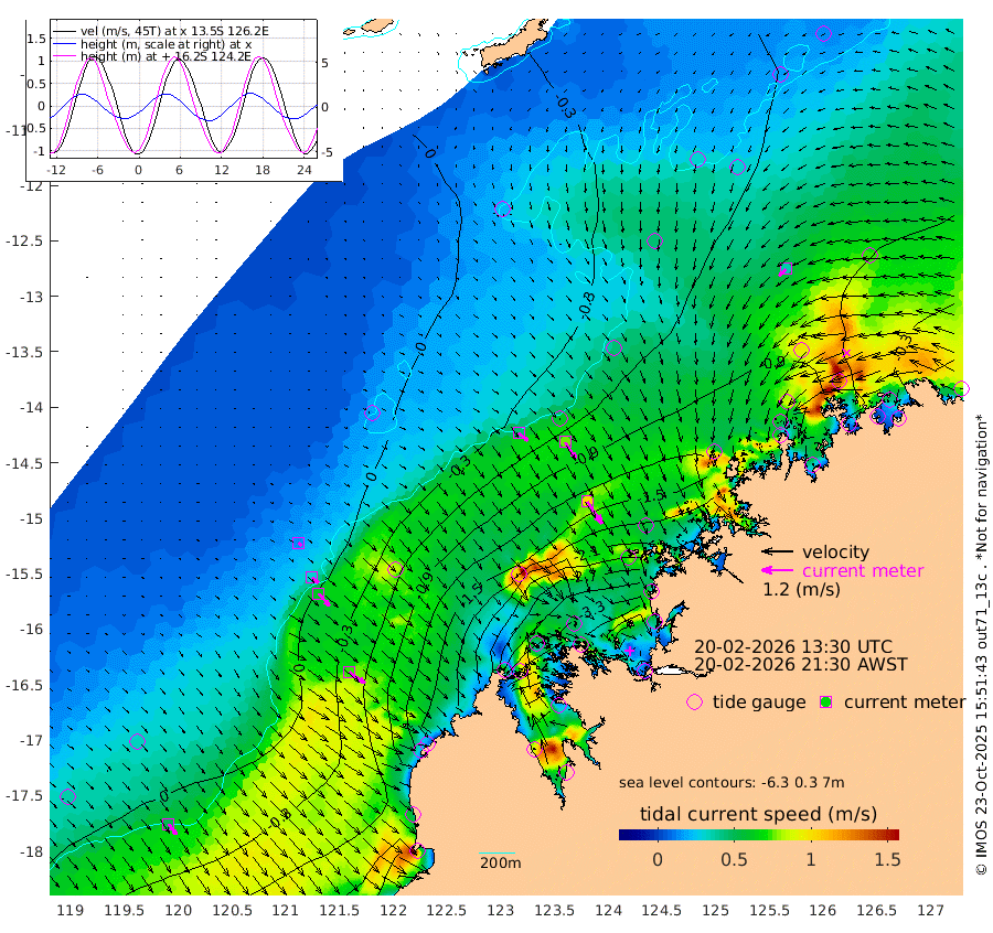 45cm/s 130T +10cm/s rms + 1cm/s 1T. NWSBRW 205m 50cm/s 143T +11cm/s rms + 6cm/s -110T. NWSROW 199m 102cm/s 146T +5cm/s rms + 2cm/s 65T. CAM050 58m 77cm/s 146T +12cm/s rms + 5cm/s 92T. CAM100 99m 15cm/s 133T +7cm/s rms + 1cm/s -85T. KIM400 396m 32cm/s 131T +9cm/s rms + 5cm/s -119T. KIM200 208m 62cm/s 139T +11cm/s rms + 5cm/s -147T. KIM100 99m 73cm/s 125T +8cm/s rms + 3cm/s -103T. KIM050 59m 38cm/s -133T +4cm/s rms + 2cm/s 23T. TIMORS88 91m -125cm Imperieuse Reef 14cm Mermaid Reef -48cm Broome -27cm Cape Baskerville -115cm Red Bluff -17cm Cape Boileau 16cm Scott Reef (WA) -31cm Ashmore Reef -268cm Karrakatta Bay -275cm Sunday Island -484cm Valentine Island -477cm Derby -432cm Port Usborne -220cm Bedford Islands -248cm Yampi Sound (Koolan Island) -232cm Macleay Island -102cm Adele Island 93cm Browse Island -368cm Shale Island -325cm Lizard Island -187cm Hall Point -148cm Degerando Island -104cm White Island -19cm Skua No. 4 Well -34cm Jabiru -42cm Maret Island -46cm Baudin Island -33cm Cape Voltaire (Krait Bay) -51cm Dillon Shoal 21cm Laminaria -68cm Port Warrender -39cm Troughton Island -31cm Cassini Island -15cm West Holothuria Reef Offshore -36cm Jar Island -29cm Lynher Bank -12cm Heywood Shoal -31cm Pee Shoal -17cm Van Cloon Shoal 24cm Carronade Island 29cm Guy Point 36cm Napier Broome Bay 48cm Lesueur Island