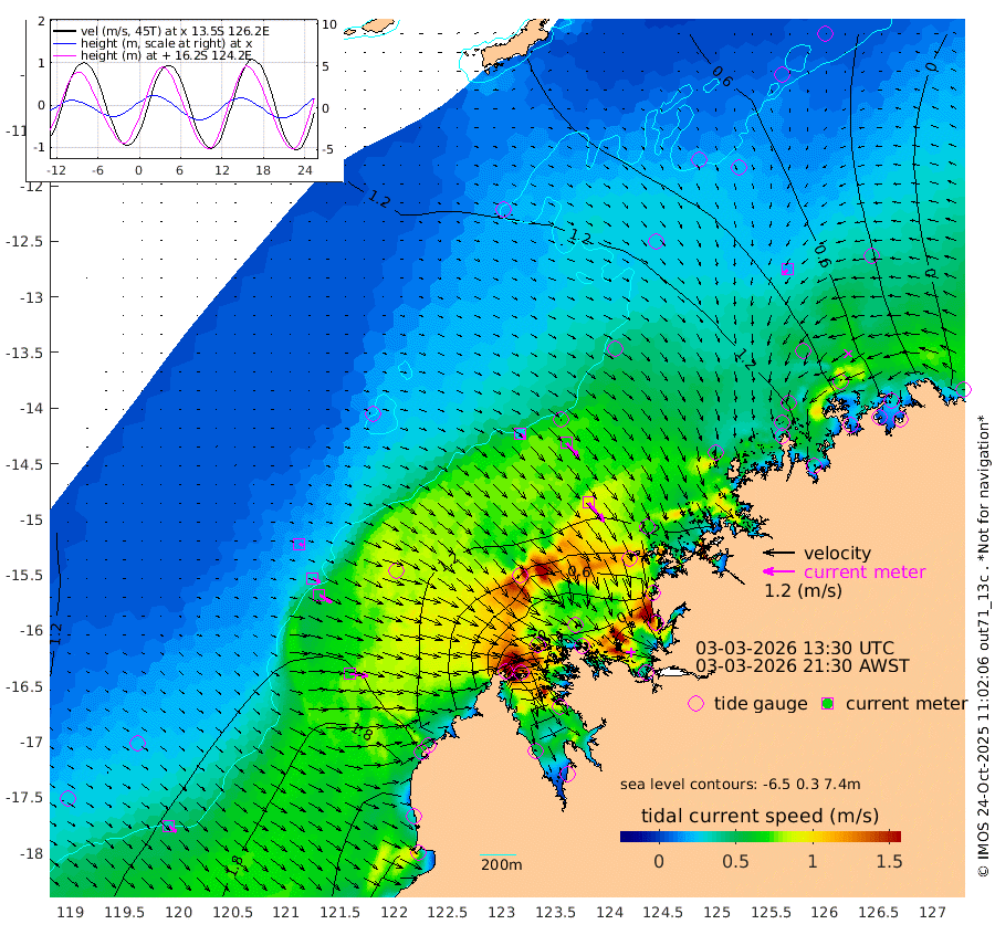 27cm/s 119T +10cm/s rms + 1cm/s 1T. NWSBRW 205m 36cm/s 131T +11cm/s rms + 6cm/s -110T. NWSROW 199m 94cm/s 141T +5cm/s rms + 2cm/s 65T. CAM050 58m 68cm/s 137T +12cm/s rms + 5cm/s 92T. CAM100 99m 16cm/s 109T +7cm/s rms + 1cm/s -85T. KIM400 396m 32cm/s 116T +9cm/s rms + 5cm/s -119T. KIM200 208m 55cm/s 122T +11cm/s rms + 5cm/s -147T. KIM100 99m 68cm/s 98T +8cm/s rms + 3cm/s -103T. KIM050 59m 20cm/s -129T +4cm/s rms + 2cm/s 23T. TIMORS88 91m 2cm Imperieuse Reef 134cm Mermaid Reef 245cm Broome 194cm Cape Baskerville 152cm Red Bluff 198cm Cape Boileau 127cm Scott Reef (WA) 107cm Ashmore Reef 35cm Karrakatta Bay 5cm Sunday Island -297cm Valentine Island -384cm Derby -244cm Port Usborne 93cm Bedford Islands 123cm Yampi Sound (Koolan Island) 182cm Macleay Island 165cm Adele Island 206cm Browse Island 74cm Shale Island 87cm Lizard Island 196cm Hall Point 164cm Degerando Island 194cm White Island 125cm Skua No. 4 Well 91cm Jabiru 200cm Maret Island 185cm Baudin Island 183cm Cape Voltaire (Krait Bay) 69cm Dillon Shoal 105cm Laminaria 180cm Port Warrender 117cm Troughton Island 176cm Cassini Island 145cm West Holothuria Reef Offshore 111cm Jar Island 143cm Lynher Bank 179cm Heywood Shoal 96cm Pee Shoal 74cm Van Cloon Shoal 107cm Carronade Island 118cm Guy Point 119cm Napier Broome Bay 36cm Lesueur Island