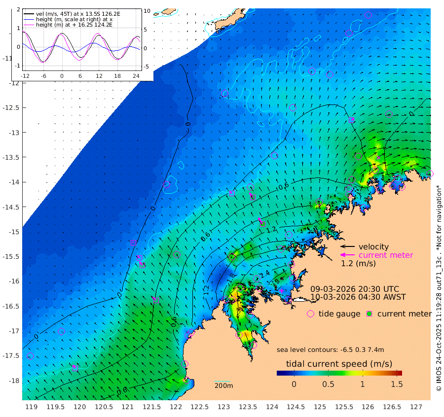 25cm/s -49T +10cm/s rms + 1cm/s 1T. NWSBRW 205m 32cm/s -37T +11cm/s rms + 6cm/s -110T. NWSROW 199m 64cm/s -33T +5cm/s rms + 2cm/s 65T. CAM050 58m 48cm/s -32T +12cm/s rms + 5cm/s 92T. CAM100 99m 8cm/s -42T +7cm/s rms + 1cm/s -85T. KIM400 396m 20cm/s -46T +9cm/s rms + 5cm/s -119T. KIM200 208m 38cm/s -42T +11cm/s rms + 5cm/s -147T. KIM100 99m 44cm/s -52T +8cm/s rms + 3cm/s -103T. KIM050 59m 21cm/s 48T +4cm/s rms + 2cm/s 23T. TIMORS88 91m 64cm Imperieuse Reef -12cm Mermaid Reef 30cm Broome 8cm Cape Baskerville 73cm Red Bluff 5cm Cape Boileau -14cm Scott Reef (WA) 3cm Ashmore Reef 166cm Karrakatta Bay 181cm Sunday Island 303cm Valentine Island 290cm Derby 271cm Port Usborne 139cm Bedford Islands 163cm Yampi Sound (Koolan Island) 158cm Macleay Island 62cm Adele Island -66cm Browse Island 243cm Shale Island 255cm Lizard Island 148cm Hall Point 87cm Degerando Island 73cm White Island -6cm Skua No. 4 Well 0cm Jabiru 14cm Maret Island 10cm Baudin Island 1cm Cape Voltaire (Krait Bay) 5cm Dillon Shoal -20cm Laminaria 24cm Port Warrender -20cm Troughton Island -15cm Cassini Island -16cm West Holothuria Reef Offshore -12cm Jar Island 21cm Lynher Bank -4cm Heywood Shoal -4cm Pee Shoal -24cm Van Cloon Shoal -54cm Carronade Island -55cm Guy Point -62cm Napier Broome Bay -98cm Lesueur Island
