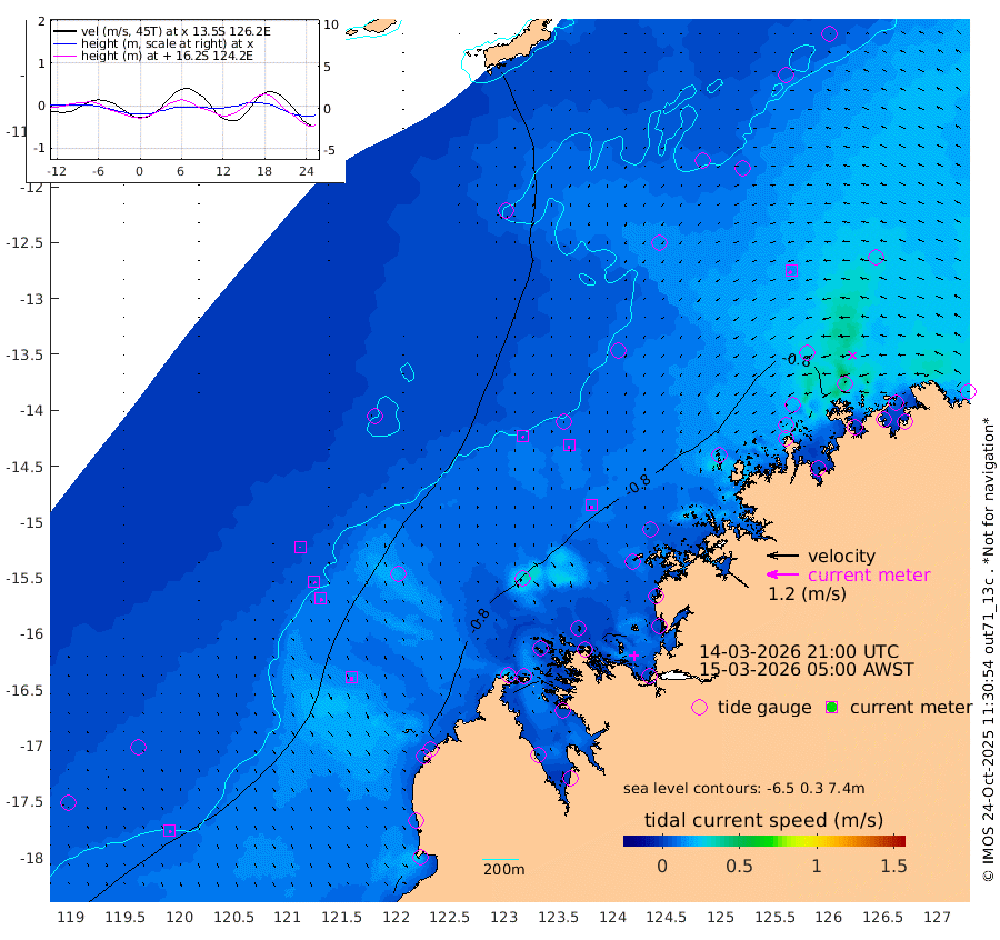 7cm/s 145T +10cm/s rms + 1cm/s 1T. NWSBRW 205m 9cm/s 156T +11cm/s rms + 6cm/s -110T. NWSROW 199m 11cm/s -178T +5cm/s rms + 2cm/s 65T. CAM050 58m 9cm/s 179T +12cm/s rms + 5cm/s 92T. CAM100 99m 3cm/s 166T +7cm/s rms + 1cm/s -85T. KIM400 396m 6cm/s 155T +9cm/s rms + 5cm/s -119T. KIM200 208m 12cm/s 166T +11cm/s rms + 5cm/s -147T. KIM100 99m 13cm/s -179T +8cm/s rms + 3cm/s -103T. KIM050 59m 14cm/s -126T +4cm/s rms + 2cm/s 23T. TIMORS88 91m -61cm Imperieuse Reef -46cm Mermaid Reef -92cm Broome -85cm Cape Baskerville -114cm Red Bluff -92cm Cape Boileau -48cm Scott Reef (WA) -63cm Ashmore Reef -109cm Karrakatta Bay -116cm Sunday Island -124cm Valentine Island -85cm Derby -91cm Port Usborne -121cm Bedford Islands -123cm Yampi Sound (Koolan Island) -139cm Macleay Island -103cm Adele Island -34cm Browse Island -134cm Shale Island -131cm Lizard Island -129cm Hall Point -116cm Degerando Island -98cm White Island -66cm Skua No. 4 Well -68cm Jabiru -93cm Maret Island -83cm Baudin Island -89cm Cape Voltaire (Krait Bay) -70cm Dillon Shoal -42cm Laminaria -121cm Port Warrender -89cm Troughton Island -94cm Cassini Island -81cm West Holothuria Reef Offshore -75cm Jar Island -66cm Lynher Bank -83cm Heywood Shoal -78cm Pee Shoal -75cm Van Cloon Shoal -68cm Carronade Island -72cm Guy Point -78cm Napier Broome Bay -52cm Lesueur Island