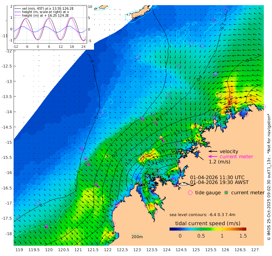 38cm/s 131T +10cm/s rms + 1cm/s 1T. NWSBRW 205m 45cm/s 145T +11cm/s rms + 6cm/s -110T. NWSROW 199m 87cm/s 146T +5cm/s rms + 2cm/s 65T. CAM050 58m 65cm/s 147T +12cm/s rms + 5cm/s 92T. CAM100 99m 14cm/s 133T +7cm/s rms + 1cm/s -85T. KIM400 396m 29cm/s 133T +9cm/s rms + 5cm/s -119T. KIM200 208m 55cm/s 140T +11cm/s rms + 5cm/s -147T. KIM100 99m 63cm/s 128T +8cm/s rms + 3cm/s -103T. KIM050 59m 33cm/s -128T +4cm/s rms + 2cm/s 23T. TIMORS88 91m -121cm Imperieuse Reef 3cm Mermaid Reef -61cm Broome -34cm Cape Baskerville -103cm Red Bluff -33cm Cape Boileau 1cm Scott Reef (WA) -41cm Ashmore Reef -234cm Karrakatta Bay -249cm Sunday Island -392cm Valentine Island -400cm Derby -372cm Port Usborne -219cm Bedford Islands -227cm Yampi Sound (Koolan Island) -203cm Macleay Island -100cm Adele Island 71cm Browse Island -325cm Shale Island -293cm Lizard Island -117cm Hall Point -154cm Degerando Island -97cm White Island -31cm Skua No. 4 Well -31cm Jabiru -59cm Maret Island -45cm Baudin Island -54cm Cape Voltaire (Krait Bay) -53cm Dillon Shoal 12cm Laminaria -80cm Port Warrender -50cm Troughton Island -48cm Cassini Island -22cm West Holothuria Reef Offshore -43cm Jar Island -44cm Lynher Bank -31cm Heywood Shoal -44cm Pee Shoal -29cm Van Cloon Shoal 3cm Carronade Island 8cm Guy Point 11cm Napier Broome Bay 25cm Lesueur Island