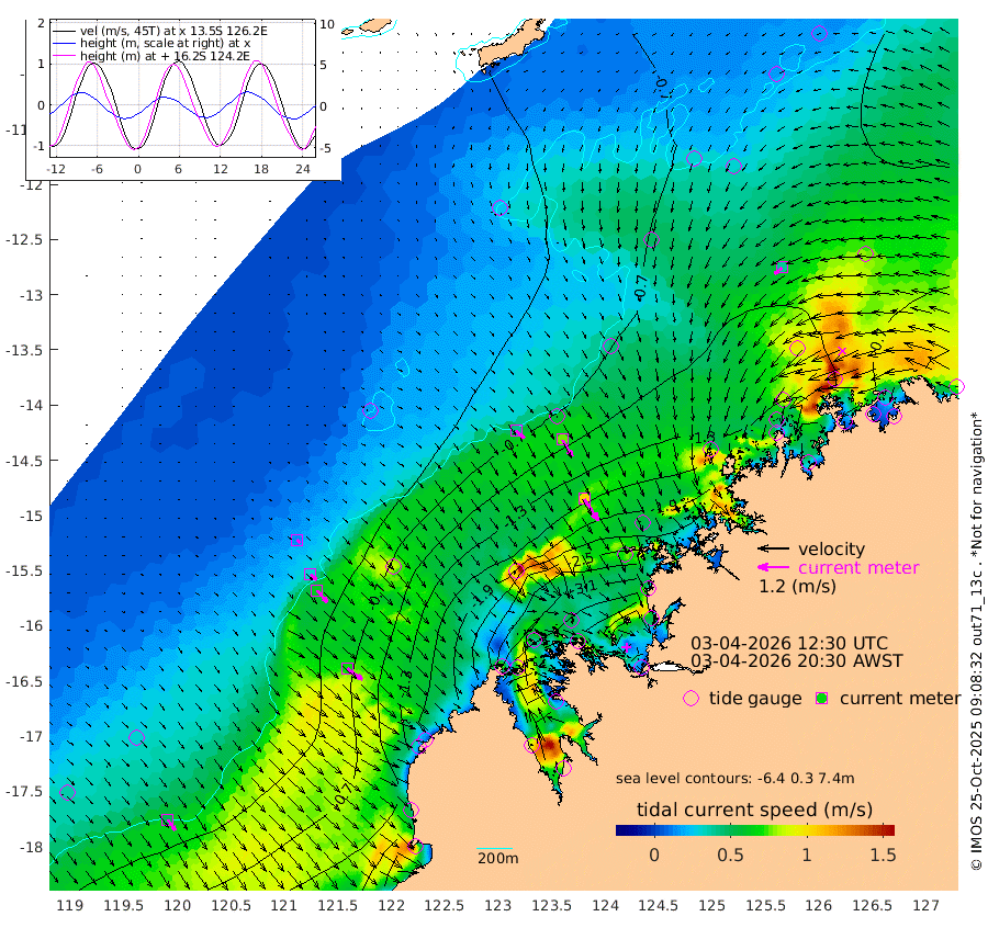 43cm/s 132T +10cm/s rms + 1cm/s 1T. NWSBRW 205m 50cm/s 145T +11cm/s rms + 6cm/s -110T. NWSROW 199m 100cm/s 147T +5cm/s rms + 2cm/s 65T. CAM050 58m 75cm/s 149T +12cm/s rms + 5cm/s 92T. CAM100 99m 15cm/s 134T +7cm/s rms + 1cm/s -85T. KIM400 396m 31cm/s 132T +9cm/s rms + 5cm/s -119T. KIM200 208m 61cm/s 139T +11cm/s rms + 5cm/s -147T. KIM100 99m 71cm/s 127T +8cm/s rms + 3cm/s -103T. KIM050 59m 39cm/s -129T +4cm/s rms + 2cm/s 23T. TIMORS88 91m -142cm Imperieuse Reef -6cm Mermaid Reef -65cm Broome -38cm Cape Baskerville -107cm Red Bluff -41cm Cape Boileau -8cm Scott Reef (WA) -52cm Ashmore Reef -268cm Karrakatta Bay -298cm Sunday Island -462cm Valentine Island -481cm Derby -439cm Port Usborne -244cm Bedford Islands -258cm Yampi Sound (Koolan Island) -233cm Macleay Island -115cm Adele Island 80cm Browse Island -367cm Shale Island -341cm Lizard Island -174cm Hall Point -170cm Degerando Island -117cm White Island -40cm Skua No. 4 Well -64cm Jabiru -64cm Maret Island -58cm Baudin Island -61cm Cape Voltaire (Krait Bay) -74cm Dillon Shoal -5cm Laminaria -95cm Port Warrender -65cm Troughton Island -50cm Cassini Island -36cm West Holothuria Reef Offshore -59cm Jar Island -60cm Lynher Bank -41cm Heywood Shoal -57cm Pee Shoal -48cm Van Cloon Shoal -13cm Carronade Island -12cm Guy Point -7cm Napier Broome Bay 0cm Lesueur Island