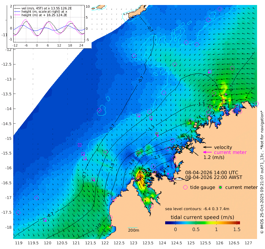 28cm/s 140T +10cm/s rms + 1cm/s 1T. NWSBRW 205m 25cm/s 149T +11cm/s rms + 6cm/s -110T. NWSROW 199m 46cm/s 156T +5cm/s rms + 2cm/s 65T. CAM050 58m 35cm/s 160T +12cm/s rms + 5cm/s 92T. CAM100 99m 6cm/s 159T +7cm/s rms + 1cm/s -85T. KIM400 396m 14cm/s 144T +9cm/s rms + 5cm/s -119T. KIM200 208m 28cm/s 150T +11cm/s rms + 5cm/s -147T. KIM100 99m 34cm/s 141T +8cm/s rms + 3cm/s -103T. KIM050 59m 29cm/s -123T +4cm/s rms + 2cm/s 23T. TIMORS88 91m -102cm Imperieuse Reef -46cm Mermaid Reef -104cm Broome -76cm Cape Baskerville -129cm Red Bluff -70cm Cape Boileau -40cm Scott Reef (WA) -72cm Ashmore Reef -208cm Karrakatta Bay -212cm Sunday Island -287cm Valentine Island -259cm Derby -257cm Port Usborne -179cm Bedford Islands -218cm Yampi Sound (Koolan Island) -211cm Macleay Island -124cm Adele Island 9cm Browse Island -292cm Shale Island -300cm Lizard Island -279cm Hall Point -150cm Degerando Island -142cm White Island -64cm Skua No. 4 Well -97cm Jabiru -94cm Maret Island -95cm Baudin Island -84cm Cape Voltaire (Krait Bay) -73cm Dillon Shoal -51cm Laminaria -109cm Port Warrender -79cm Troughton Island -76cm Cassini Island -71cm West Holothuria Reef Offshore -77cm Jar Island -79cm Lynher Bank -74cm Heywood Shoal -69cm Pee Shoal -59cm Van Cloon Shoal -40cm Carronade Island -42cm Guy Point -38cm Napier Broome Bay -16cm Lesueur Island
