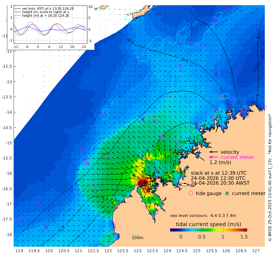 9cm/s -72T +10cm/s rms + 1cm/s 1T. NWSBRW 205m 11cm/s -65T +11cm/s rms + 6cm/s -110T. NWSROW 199m 33cm/s -46T +5cm/s rms + 2cm/s 65T. CAM050 58m 26cm/s -58T +12cm/s rms + 5cm/s 92T. CAM100 99m 7cm/s -83T +7cm/s rms + 1cm/s -85T. KIM400 396m 13cm/s -78T +9cm/s rms + 5cm/s -119T. KIM200 208m 21cm/s -70T +11cm/s rms + 5cm/s -147T. KIM100 99m 29cm/s -103T +8cm/s rms + 3cm/s -103T. KIM050 59m 7cm/s -48T +4cm/s rms + 2cm/s 23T. TIMORS88 91m -31cm Imperieuse Reef -85cm Mermaid Reef -176cm Broome -126cm Cape Baskerville -133cm Red Bluff -118cm Cape Boileau -71cm Scott Reef (WA) -71cm Ashmore Reef -85cm Karrakatta Bay -74cm Sunday Island 112cm Valentine Island 166cm Derby 71cm Port Usborne -122cm Bedford Islands -157cm Yampi Sound (Koolan Island) -133cm Macleay Island -113cm Adele Island -90cm Browse Island -163cm Shale Island -183cm Lizard Island -203cm Hall Point -149cm Degerando Island -165cm White Island -67cm Skua No. 4 Well -61cm Jabiru -134cm Maret Island -131cm Baudin Island -124cm Cape Voltaire (Krait Bay) -31cm Dillon Shoal -65cm Laminaria -128cm Port Warrender -66cm Troughton Island -104cm Cassini Island -84cm West Holothuria Reef Offshore -79cm Jar Island -110cm Lynher Bank -112cm Heywood Shoal -49cm Pee Shoal -40cm Van Cloon Shoal -58cm Carronade Island -59cm Guy Point -57cm Napier Broome Bay -14cm Lesueur Island
