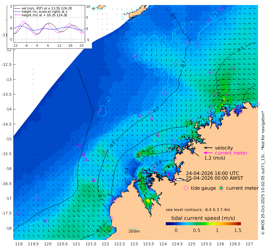 18cm/s 135T +10cm/s rms + 1cm/s 1T. NWSBRW 205m 20cm/s 150T +11cm/s rms + 6cm/s -110T. NWSROW 199m 36cm/s 158T +5cm/s rms + 2cm/s 65T. CAM050 58m 27cm/s 159T +12cm/s rms + 5cm/s 92T. CAM100 99m 4cm/s 162T +7cm/s rms + 1cm/s -85T. KIM400 396m 11cm/s 138T +9cm/s rms + 5cm/s -119T. KIM200 208m 23cm/s 145T +11cm/s rms + 5cm/s -147T. KIM100 99m 23cm/s 140T +8cm/s rms + 3cm/s -103T. KIM050 59m 28cm/s -124T +4cm/s rms + 2cm/s 23T. TIMORS88 91m -82cm Imperieuse Reef -35cm Mermaid Reef -53cm Broome -40cm Cape Baskerville -53cm Red Bluff -47cm Cape Boileau -42cm Scott Reef (WA) -59cm Ashmore Reef -145cm Karrakatta Bay -165cm Sunday Island -239cm Valentine Island -250cm Derby -233cm Port Usborne -129cm Bedford Islands -132cm Yampi Sound (Koolan Island) -163cm Macleay Island -93cm Adele Island 4cm Browse Island -182cm Shale Island -200cm Lizard Island -114cm Hall Point -94cm Degerando Island -71cm White Island -65cm Skua No. 4 Well -87cm Jabiru -58cm Maret Island -46cm Baudin Island -51cm Cape Voltaire (Krait Bay) -73cm Dillon Shoal -55cm Laminaria -55cm Port Warrender -62cm Troughton Island -53cm Cassini Island -50cm West Holothuria Reef Offshore -46cm Jar Island -59cm Lynher Bank -53cm Heywood Shoal -73cm Pee Shoal -56cm Van Cloon Shoal -28cm Carronade Island -31cm Guy Point -37cm Napier Broome Bay -18cm Lesueur Island