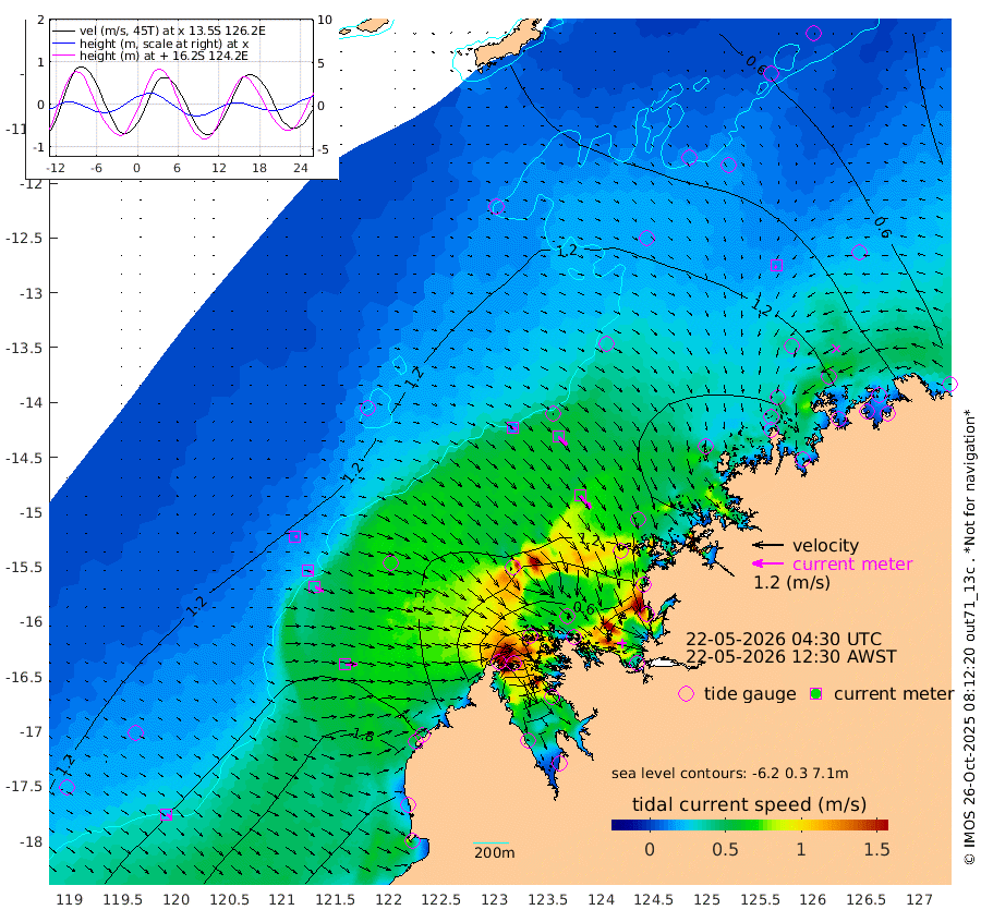 15cm/s 106T +10cm/s rms + 1cm/s 1T. NWSBRW 205m 24cm/s 127T +11cm/s rms + 6cm/s -110T. NWSROW 199m 64cm/s 139T +5cm/s rms + 2cm/s 65T. CAM050 58m 45cm/s 132T +12cm/s rms + 5cm/s 92T. CAM100 99m 10cm/s 105T +7cm/s rms + 1cm/s -85T. KIM400 396m 22cm/s 114T +9cm/s rms + 5cm/s -119T. KIM200 208m 38cm/s 118T +11cm/s rms + 5cm/s -147T. KIM100 99m 46cm/s 91T +8cm/s rms + 3cm/s -103T. KIM050 59m 13cm/s -141T +4cm/s rms + 2cm/s 23T. TIMORS88 91m 34cm Imperieuse Reef 122cm Mermaid Reef 230cm Broome 176cm Cape Baskerville 163cm Red Bluff 188cm Cape Boileau 110cm Scott Reef (WA) 107cm Ashmore Reef 66cm Karrakatta Bay 45cm Sunday Island -225cm Valentine Island -291cm Derby -176cm Port Usborne 110cm Bedford Islands 156cm Yampi Sound (Koolan Island) 142cm Macleay Island 144cm Adele Island 159cm Browse Island 126cm Shale Island 153cm Lizard Island 224cm Hall Point 180cm Degerando Island 204cm White Island 111cm Skua No. 4 Well 106cm Jabiru 191cm Maret Island 185cm Baudin Island 191cm Cape Voltaire (Krait Bay) 75cm Dillon Shoal 92cm Laminaria 203cm Port Warrender 136cm Troughton Island 174cm Cassini Island 148cm West Holothuria Reef Offshore 146cm Jar Island 142cm Lynher Bank 176cm Heywood Shoal 93cm Pee Shoal 103cm Van Cloon Shoal 143cm Carronade Island 149cm Guy Point 156cm Napier Broome Bay 105cm Lesueur Island