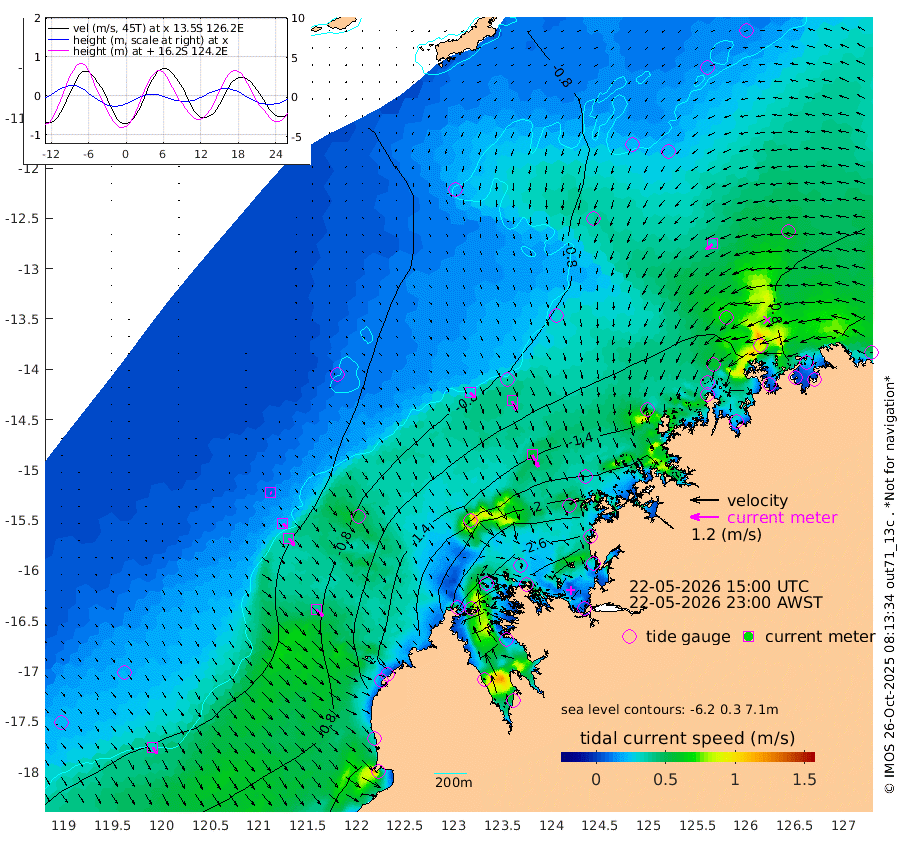 29cm/s 133T +10cm/s rms + 1cm/s 1T. NWSBRW 205m 32cm/s 149T +11cm/s rms + 6cm/s -110T. NWSROW 199m 57cm/s 153T +5cm/s rms + 2cm/s 65T. CAM050 58m 44cm/s 154T +12cm/s rms + 5cm/s 92T. CAM100 99m 8cm/s 149T +7cm/s rms + 1cm/s -85T. KIM400 396m 19cm/s 136T +9cm/s rms + 5cm/s -119T. KIM200 208m 38cm/s 142T +11cm/s rms + 5cm/s -147T. KIM100 99m 39cm/s 136T +8cm/s rms + 3cm/s -103T. KIM050 59m 35cm/s -130T +4cm/s rms + 2cm/s 23T. TIMORS88 91m -116cm Imperieuse Reef -36cm Mermaid Reef -78cm Broome -54cm Cape Baskerville -92cm Red Bluff -65cm Cape Boileau -42cm Scott Reef (WA) -72cm Ashmore Reef -210cm Karrakatta Bay -232cm Sunday Island -331cm Valentine Island -337cm Derby -319cm Port Usborne -187cm Bedford Islands -200cm Yampi Sound (Koolan Island) -215cm Macleay Island -121cm Adele Island 18cm Browse Island -276cm Shale Island -292cm Lizard Island -145cm Hall Point -142cm Degerando Island -108cm White Island -73cm Skua No. 4 Well -85cm Jabiru -80cm Maret Island -66cm Baudin Island -73cm Cape Voltaire (Krait Bay) -85cm Dillon Shoal -49cm Laminaria -88cm Port Warrender -82cm Troughton Island -72cm Cassini Island -62cm West Holothuria Reef Offshore -68cm Jar Island -74cm Lynher Bank -65cm Heywood Shoal -85cm Pee Shoal -70cm Van Cloon Shoal -38cm Carronade Island -39cm Guy Point -48cm Napier Broome Bay -23cm Lesueur Island