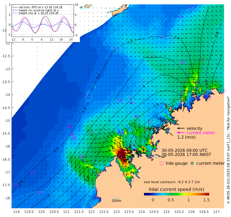 13cm/s 174T +10cm/s rms + 1cm/s 1T. NWSBRW 205m 11cm/s -177T +11cm/s rms + 6cm/s -110T. NWSROW 199m 16cm/s -106T +5cm/s rms + 2cm/s 65T. CAM050 58m 17cm/s -120T +12cm/s rms + 5cm/s 92T. CAM100 99m 7cm/s -130T +7cm/s rms + 1cm/s -85T. KIM400 396m 10cm/s -132T +9cm/s rms + 5cm/s -119T. KIM200 208m 19cm/s -139T +11cm/s rms + 5cm/s -147T. KIM100 99m 35cm/s -152T +8cm/s rms + 3cm/s -103T. KIM050 59m 18cm/s -104T +4cm/s rms + 2cm/s 23T. TIMORS88 91m -124cm Imperieuse Reef -137cm Mermaid Reef -297cm Broome -230cm Cape Baskerville -270cm Red Bluff -218cm Cape Boileau -127cm Scott Reef (WA) -154cm Ashmore Reef -281cm Karrakatta Bay -272cm Sunday Island -139cm Valentine Island -54cm Derby -150cm Port Usborne -318cm Bedford Islands -355cm Yampi Sound (Koolan Island) -387cm Macleay Island -269cm Adele Island -118cm Browse Island -403cm Shale Island -369cm Lizard Island -364cm Hall Point -309cm Degerando Island -293cm White Island -156cm Skua No. 4 Well -140cm Jabiru -255cm Maret Island -239cm Baudin Island -225cm Cape Voltaire (Krait Bay) -128cm Dillon Shoal -114cm Laminaria -254cm Port Warrender -166cm Troughton Island -217cm Cassini Island -172cm West Holothuria Reef Offshore -151cm Jar Island -188cm Lynher Bank -208cm Heywood Shoal -144cm Pee Shoal -105cm Van Cloon Shoal -98cm Carronade Island -107cm Guy Point -95cm Napier Broome Bay -13cm Lesueur Island
