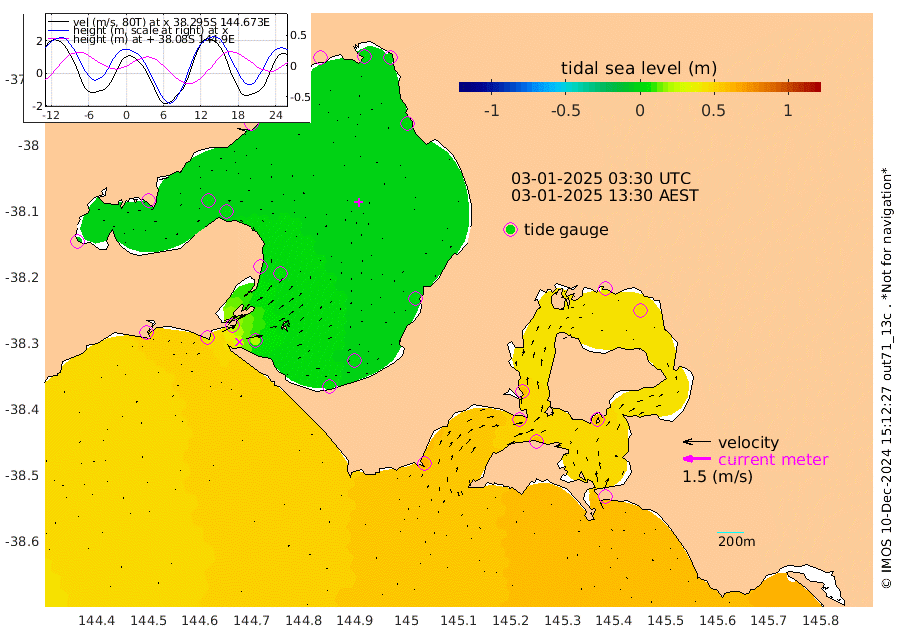 65cm San Remo 58cm Elizabeth Island 46cm Bouchier Channel 34cm Tooradin 58cm Cowes Jetty 57cm Western Port (Stony Point) 48cm Western Port (Sandy Point) 63cm Flinders Jetty 1cm Mornington 2cm Sandringham 4cm Rosebud Jetty 4cm Hovell Pile 19cm South Channel 37cm Point Lonsdale 25cm Queenscliff 4cm West Channel Pile 44cm Barwon Heads 2cm St Leonards 2cm Point Richards (Corio Bay) 1cm Point Richards Channel 0cm Geelong 0cm Werribee 2cm Altona -1cm Wilson Spit 2cm Melbourne (Williamstown) 2cm St Kilda