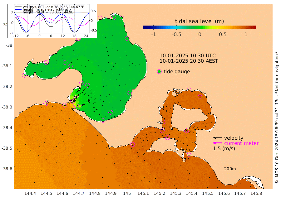 102cm San Remo 95cm Elizabeth Island 100cm Bouchier Channel 92cm Tooradin 98cm Cowes Jetty 99cm Western Port (Stony Point) 94cm Western Port (Sandy Point) 91cm Flinders Jetty -8cm Mornington -6cm Sandringham -7cm Rosebud Jetty -6cm Hovell Pile 16cm South Channel 47cm Point Lonsdale 23cm Queenscliff -5cm West Channel Pile 63cm Barwon Heads -5cm St Leonards -5cm Point Richards (Corio Bay) -5cm Point Richards Channel -7cm Geelong -8cm Werribee -5cm Altona -6cm Wilson Spit -6cm Melbourne (Williamstown) -6cm St Kilda
