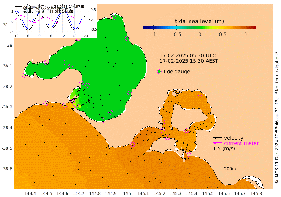 85cm San Remo 72cm Elizabeth Island 75cm Bouchier Channel 66cm Tooradin 83cm Cowes Jetty 82cm Western Port (Stony Point) 69cm Western Port (Sandy Point) 80cm Flinders Jetty -4cm Mornington -2cm Sandringham -3cm Rosebud Jetty -1cm Hovell Pile 19cm South Channel 47cm Point Lonsdale 26cm Queenscliff 0cm West Channel Pile 59cm Barwon Heads -1cm St Leonards -1cm Point Richards (Corio Bay) -1cm Point Richards Channel -3cm Geelong 0cm Werribee -1cm Altona -3cm Wilson Spit -2cm Melbourne (Williamstown) -1cm St Kilda