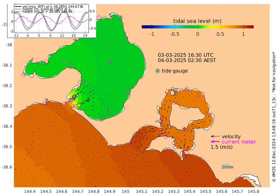104cm San Remo 90cm Elizabeth Island 85cm Bouchier Channel 68cm Tooradin 101cm Cowes Jetty 100cm Western Port (Stony Point) 81cm Western Port (Sandy Point) 103cm Flinders Jetty 0cm Mornington -3cm Sandringham 0cm Rosebud Jetty 0cm Hovell Pile 25cm South Channel 61cm Point Lonsdale 35cm Queenscliff 1cm West Channel Pile 80cm Barwon Heads 3cm St Leonards -1cm Point Richards (Corio Bay) 2cm Point Richards Channel -4cm Geelong -2cm Werribee -1cm Altona 1cm Wilson Spit -2cm Melbourne (Williamstown) 0cm St Kilda