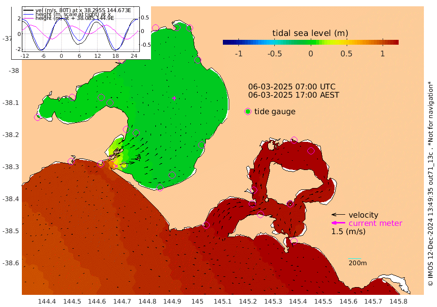138cm San Remo 128cm Elizabeth Island 132cm Bouchier Channel 119cm Tooradin 136cm Cowes Jetty 134cm Western Port (Stony Point) 123cm Western Port (Sandy Point) 126cm Flinders Jetty -3cm Mornington -1cm Sandringham -3cm Rosebud Jetty -2cm Hovell Pile 27cm South Channel 68cm Point Lonsdale 37cm Queenscliff -1cm West Channel Pile 87cm Barwon Heads 1cm St Leonards -1cm Point Richards (Corio Bay) 0cm Point Richards Channel -3cm Geelong -3cm Werribee 0cm Altona -1cm Wilson Spit -2cm Melbourne (Williamstown) -1cm St Kilda