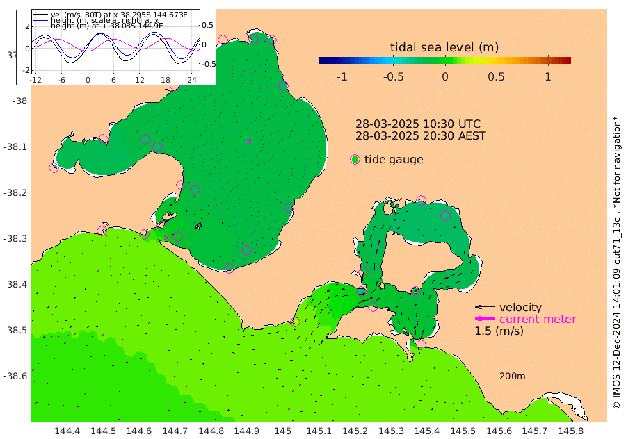 -7cm San Remo -13cm Elizabeth Island -29cm Bouchier Channel -34cm Tooradin -3cm Cowes Jetty -4cm Western Port (Stony Point) -31cm Western Port (Sandy Point) 21cm Flinders Jetty -21cm Mornington -24cm Sandringham -21cm Rosebud Jetty -20cm Hovell Pile -7cm South Channel 8cm Point Lonsdale -2cm Queenscliff -21cm West Channel Pile 19cm Barwon Heads -20cm St Leonards -24cm Point Richards (Corio Bay) -23cm Point Richards Channel -26cm Geelong -20cm Werribee -24cm Altona -23cm Wilson Spit -23cm Melbourne (Williamstown) -23cm St Kilda