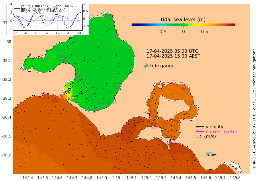 110cm San Remo 94cm Elizabeth Island 96cm Bouchier Channel 83cm Tooradin 106cm Cowes Jetty 104cm Western Port (Stony Point) 90cm Western Port (Sandy Point) 106cm Flinders Jetty -7cm Mornington -5cm Sandringham -6cm Rosebud Jetty -5cm Hovell Pile 22cm South Channel 61cm Point Lonsdale 32cm Queenscliff -3cm West Channel Pile 80cm Barwon Heads -3cm St Leonards -5cm Point Richards (Corio Bay) -4cm Point Richards Channel -7cm Geelong -7cm Werribee -4cm Altona -5cm Wilson Spit -6cm Melbourne (Williamstown) -5cm St Kilda